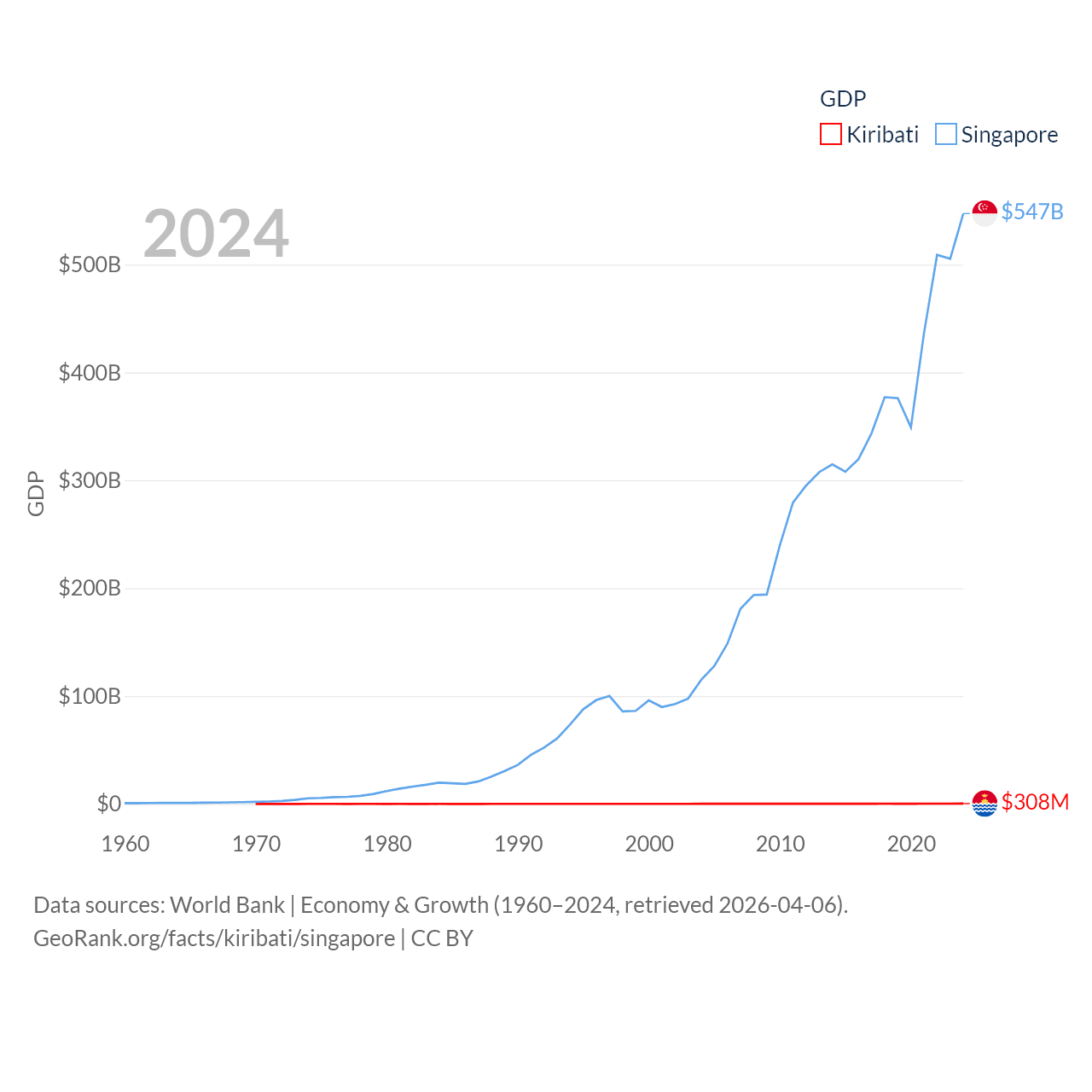 By GDP, Kiribati ranks 192/197 ($308M) and Singapore ranks 28/197 ($547B). By GDP per capita, Kiribati ranks 152/197 ($2,289), while Singapore ranks 7/197 ($90,674).