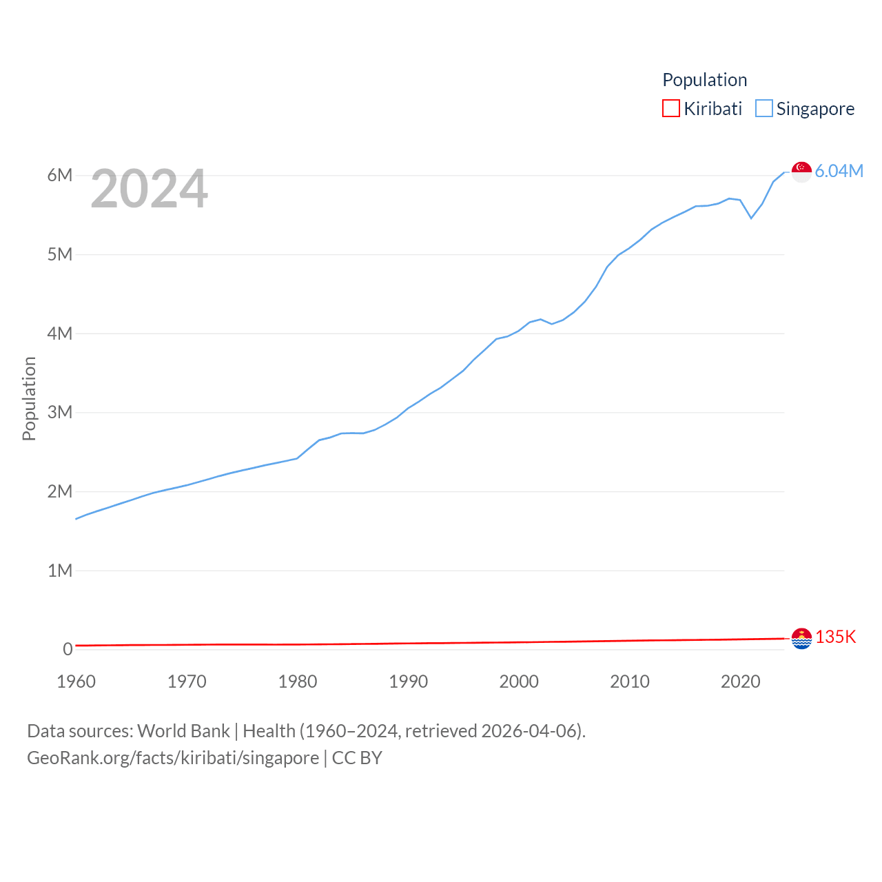 Kiribati has a population of 135K (ranked 180/197), compared with 6.04M in Singapore (ranked 113/197). Kiribati's land area is 313 sq mi versus 277.2 sq mi for Singapore (ranked 173rd vs. 177th).