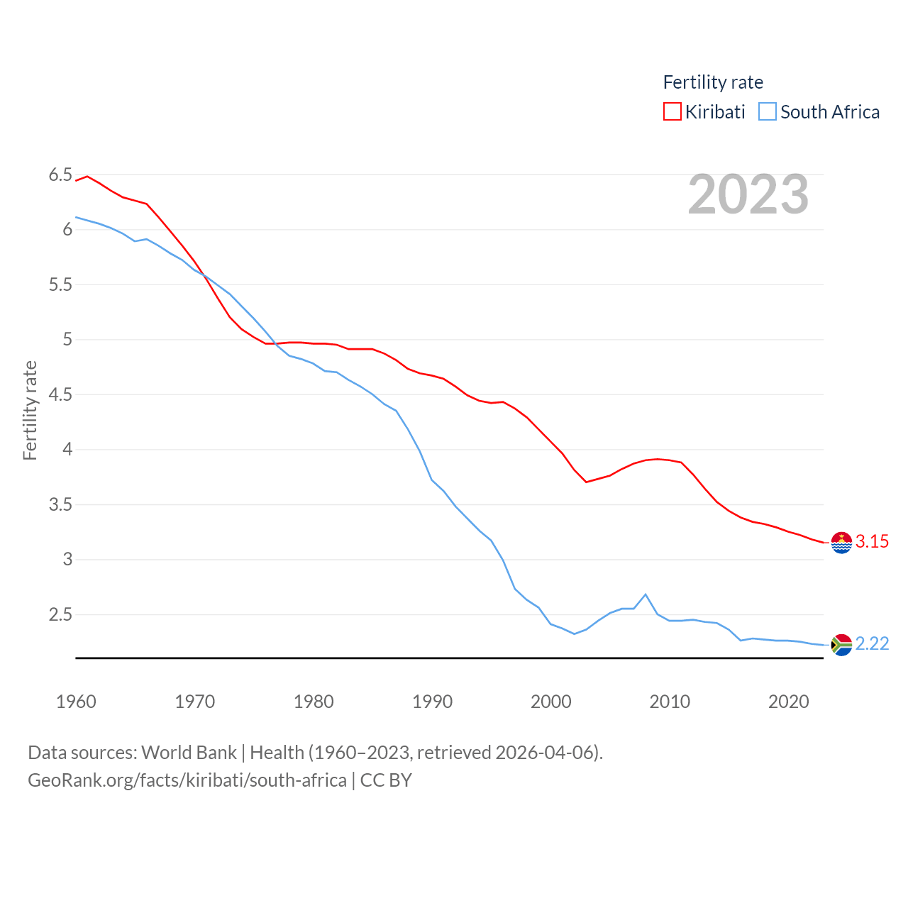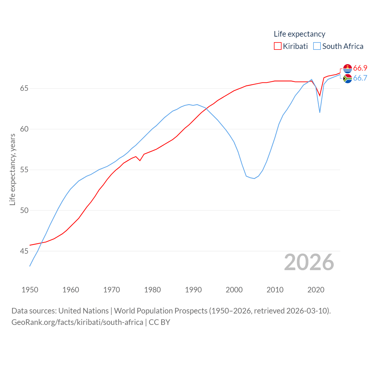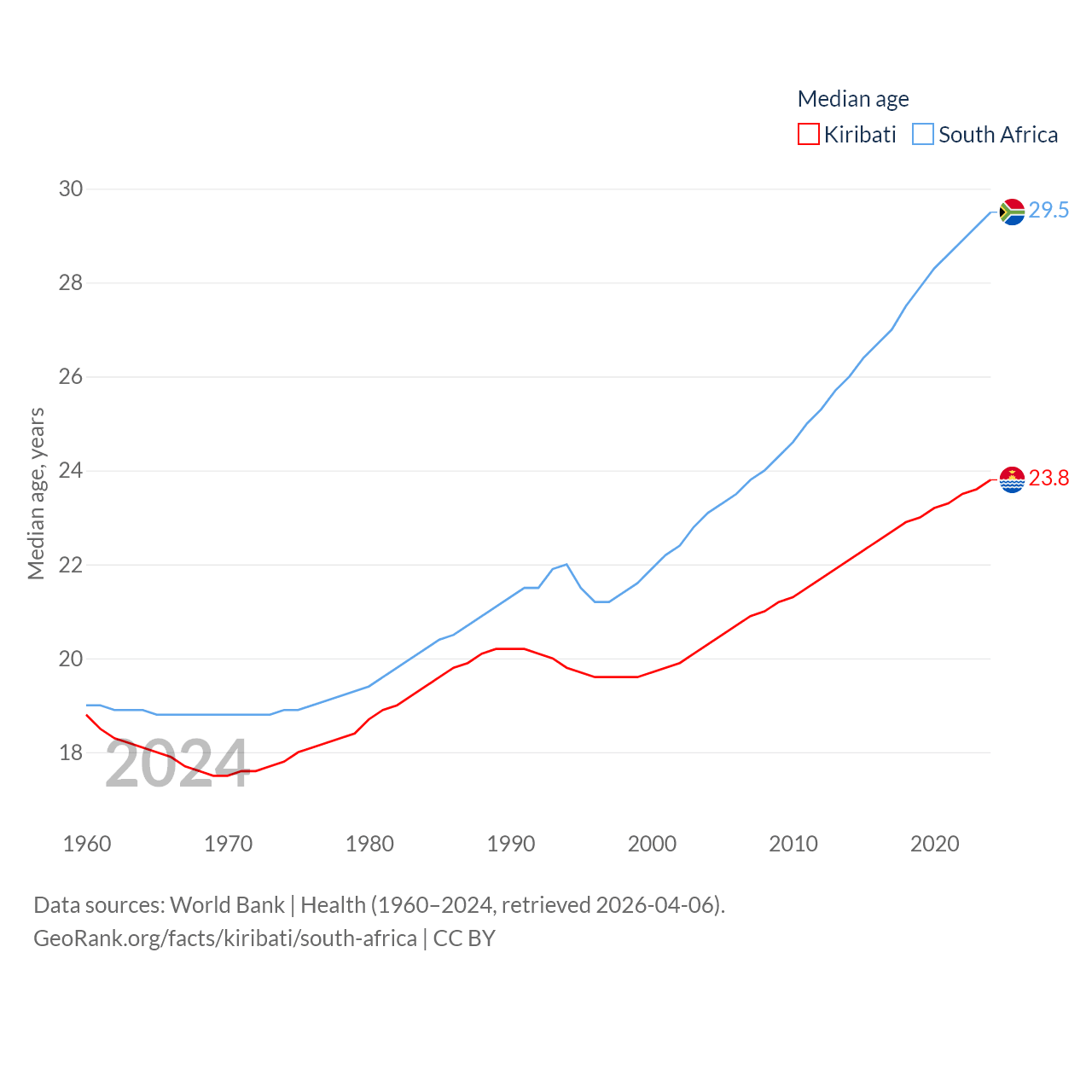 Kiribati has a population of 135K (ranked 180/197), compared with 64M in South Africa (ranked 24/197). Kiribati's land area is 313 sq mi versus 468,377 sq mi for South Africa (ranked 173rd vs. 24th).