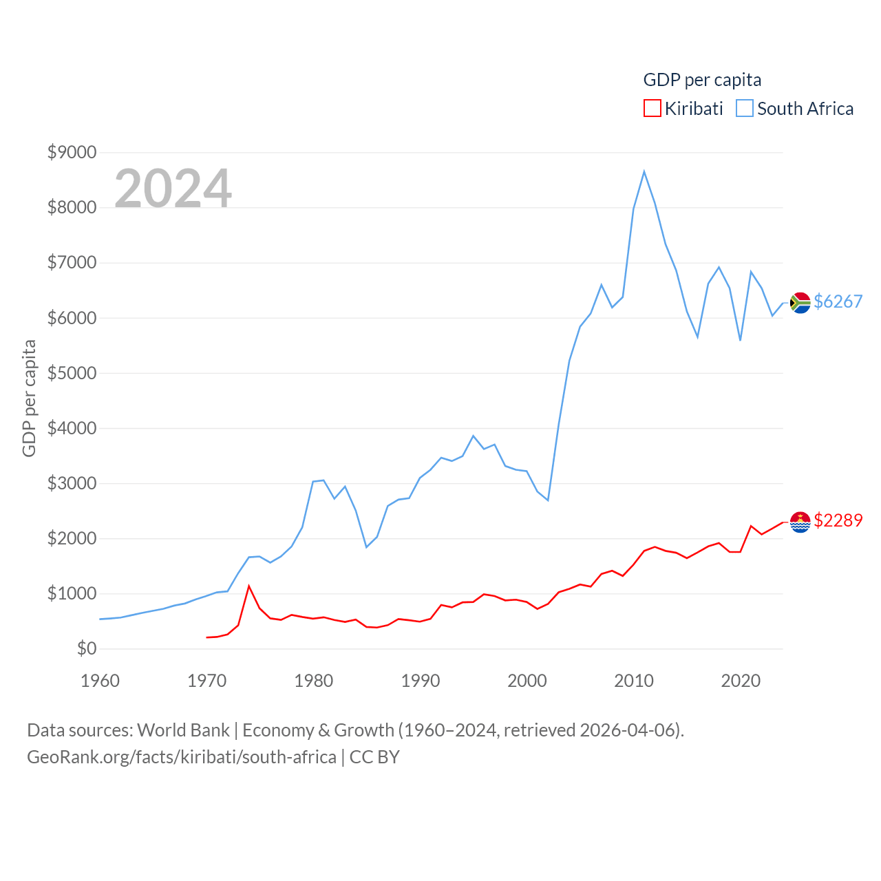 By GDP, Kiribati ranks 192/197 ($308M) and South Africa ranks 40/197 ($401B). By GDP per capita, Kiribati ranks 152/197 ($2,289), while South Africa ranks 111/197 ($6,267).