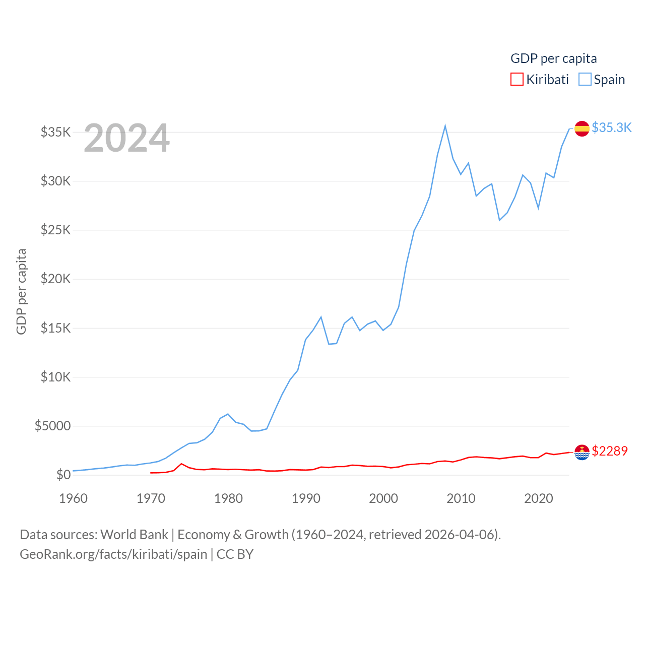 By GDP, Kiribati ranks 192/197 ($308M) and Spain ranks 15/197 ($1.73T). By GDP per capita, Kiribati ranks 152/197 ($2,289), while Spain ranks 32/197 ($35,327).