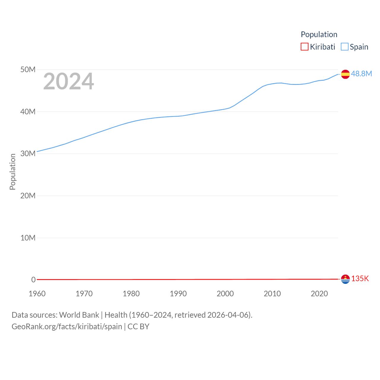 Kiribati has a population of 135K (ranked 180/197), compared with 48.8M in Spain (ranked 32/197). Kiribati's land area is 313 sq mi versus 192,934 sq mi for Spain (ranked 173rd vs. 51st).
