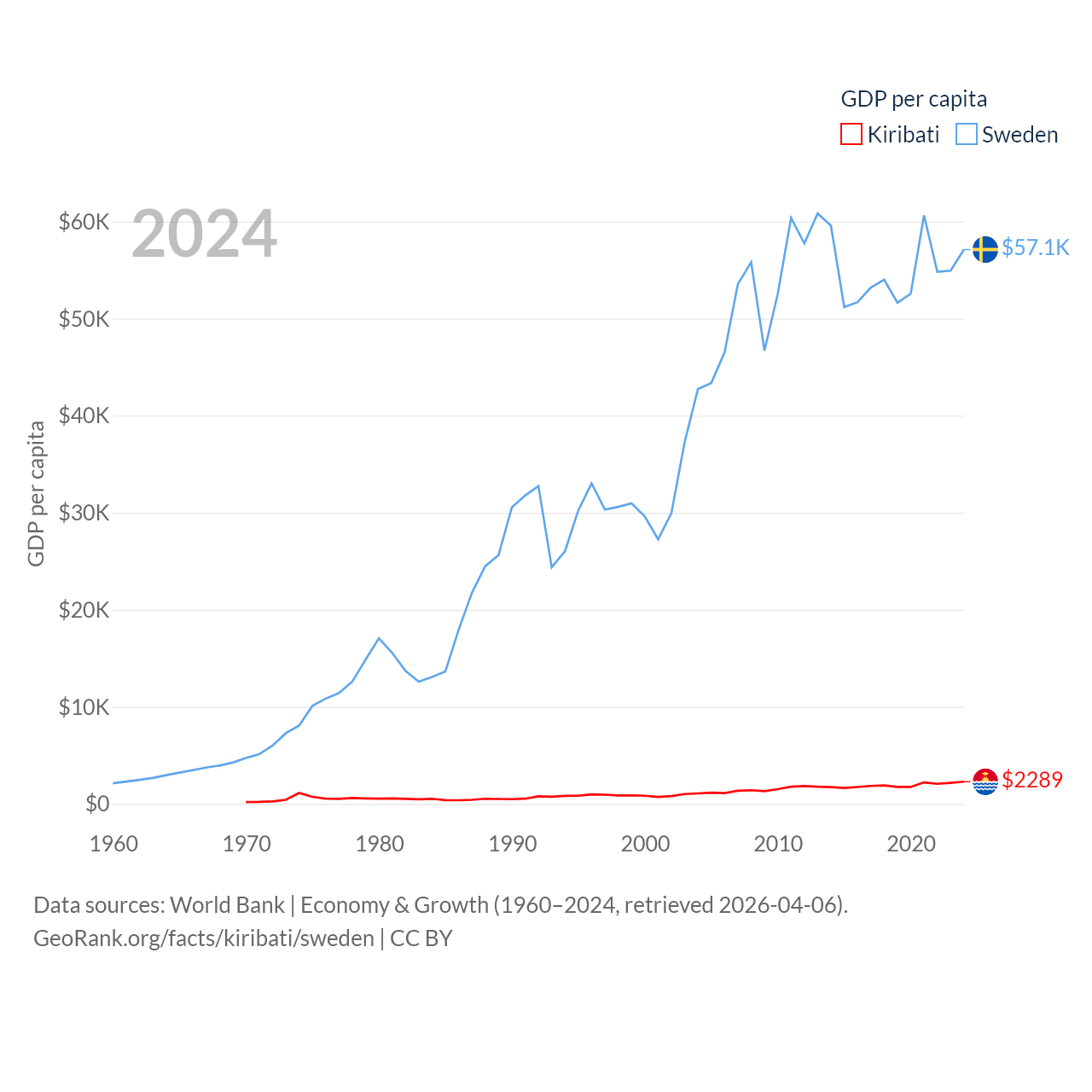 By GDP, Kiribati ranks 192/197 ($308M) and Sweden ranks 26/197 ($604B). By GDP per capita, Kiribati ranks 152/197 ($2,289), while Sweden ranks 17/197 ($57,117).