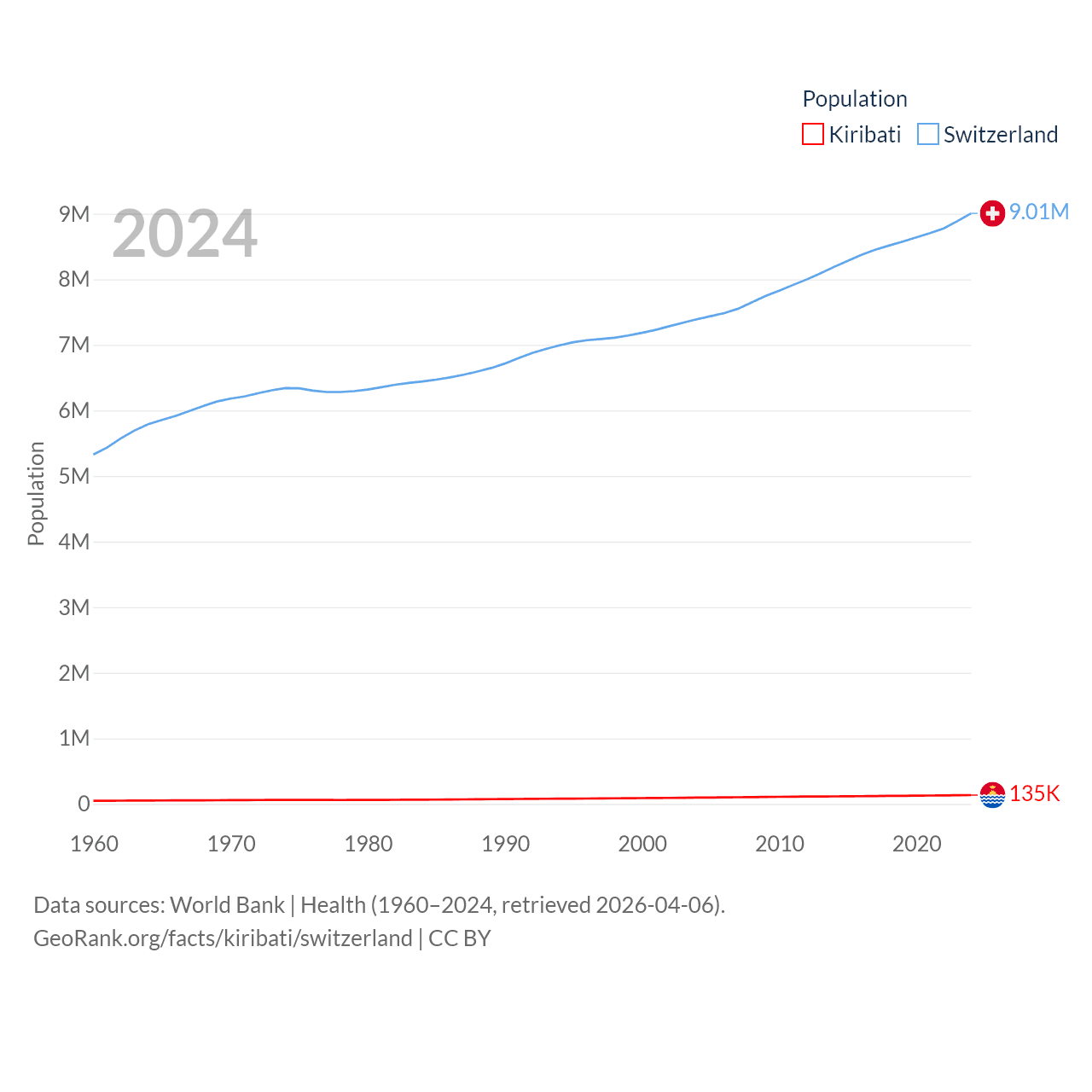 Kiribati has a population of 135K (ranked 180/197), compared with 9.01M in Switzerland (ranked 101/197). Kiribati's land area is 313 sq mi versus 15,255 sq mi for Switzerland (ranked 173rd vs. 131st).