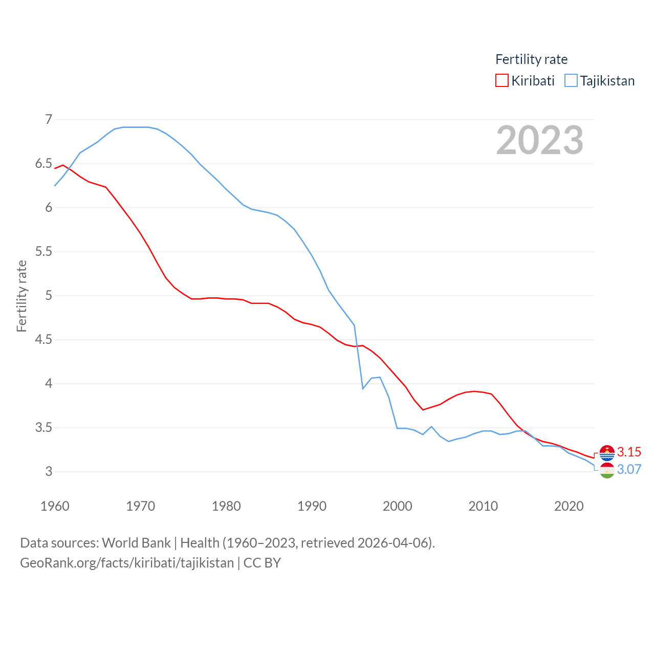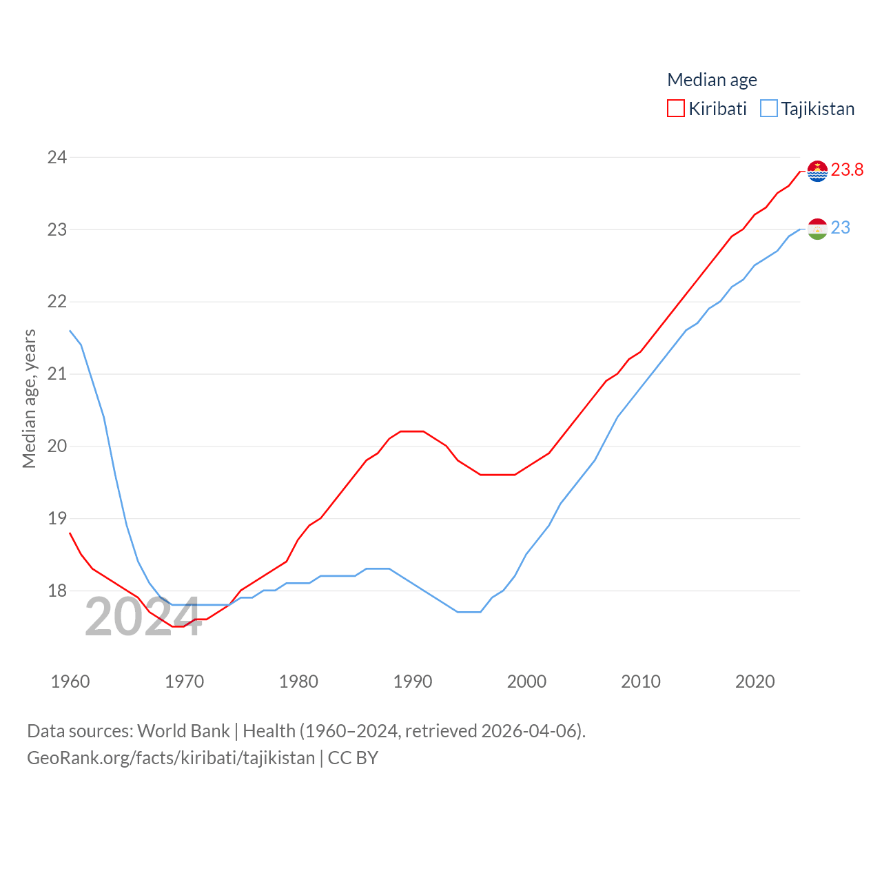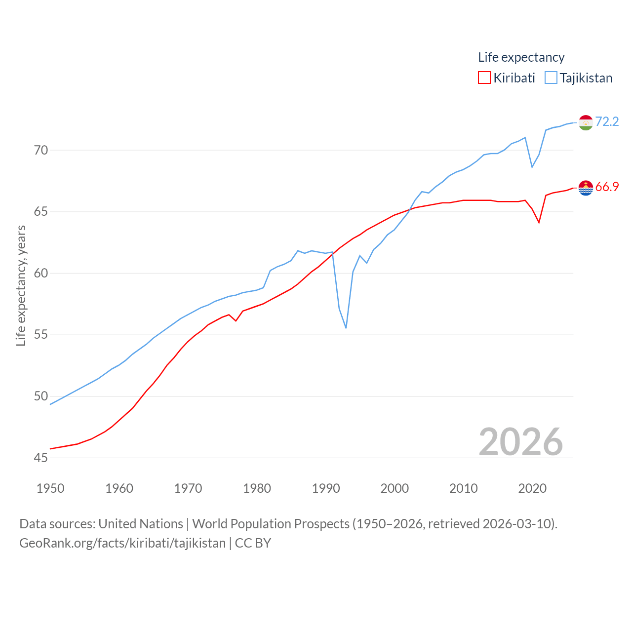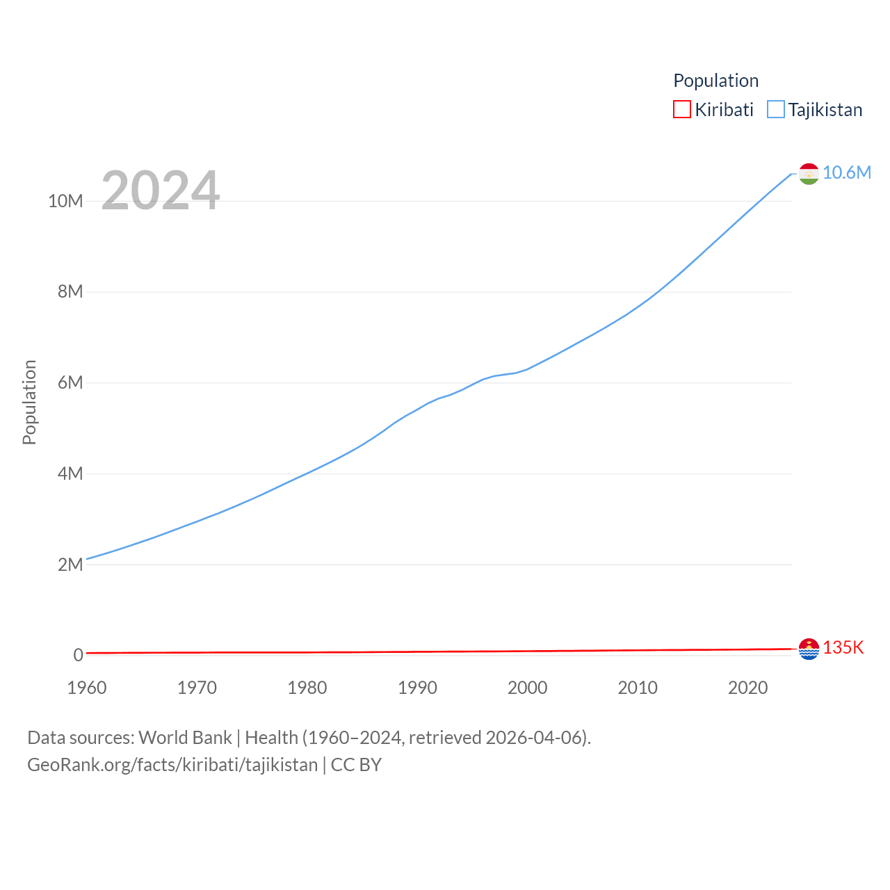 Kiribati has a population of 135K (ranked 180/197), compared with 10.6M in Tajikistan (ranked 91/197). Kiribati's land area is 313 sq mi versus 53,587 sq mi for Tajikistan (ranked 173rd vs. 93rd).