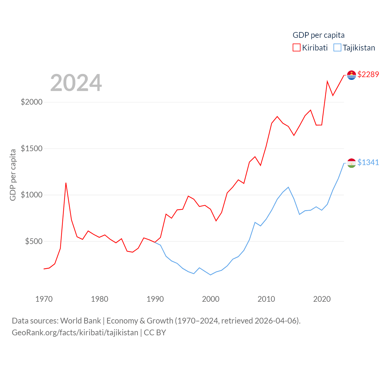 By GDP, Kiribati ranks 192/197 ($308M) and Tajikistan ranks 145/197 ($14.2B). By GDP per capita, Kiribati ranks 152/197 ($2,289), while Tajikistan ranks 166/197 ($1,341).