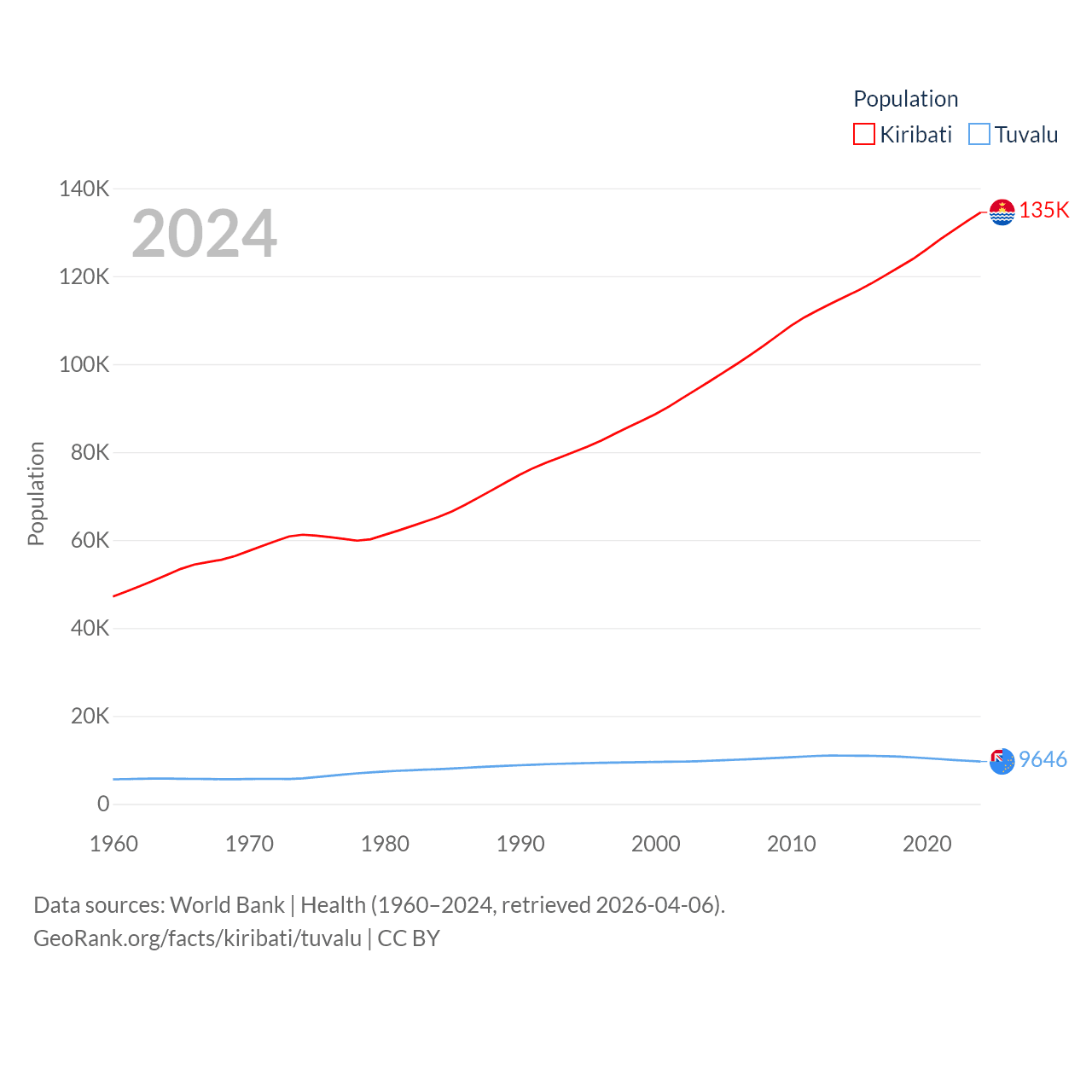 Kiribati has a population of 135K (ranked 180/197), compared with 9.65K in Tuvalu (ranked 196/197). Kiribati's land area is 313 sq mi versus 11.6 sq mi for Tuvalu (ranked 173rd vs. 194th).