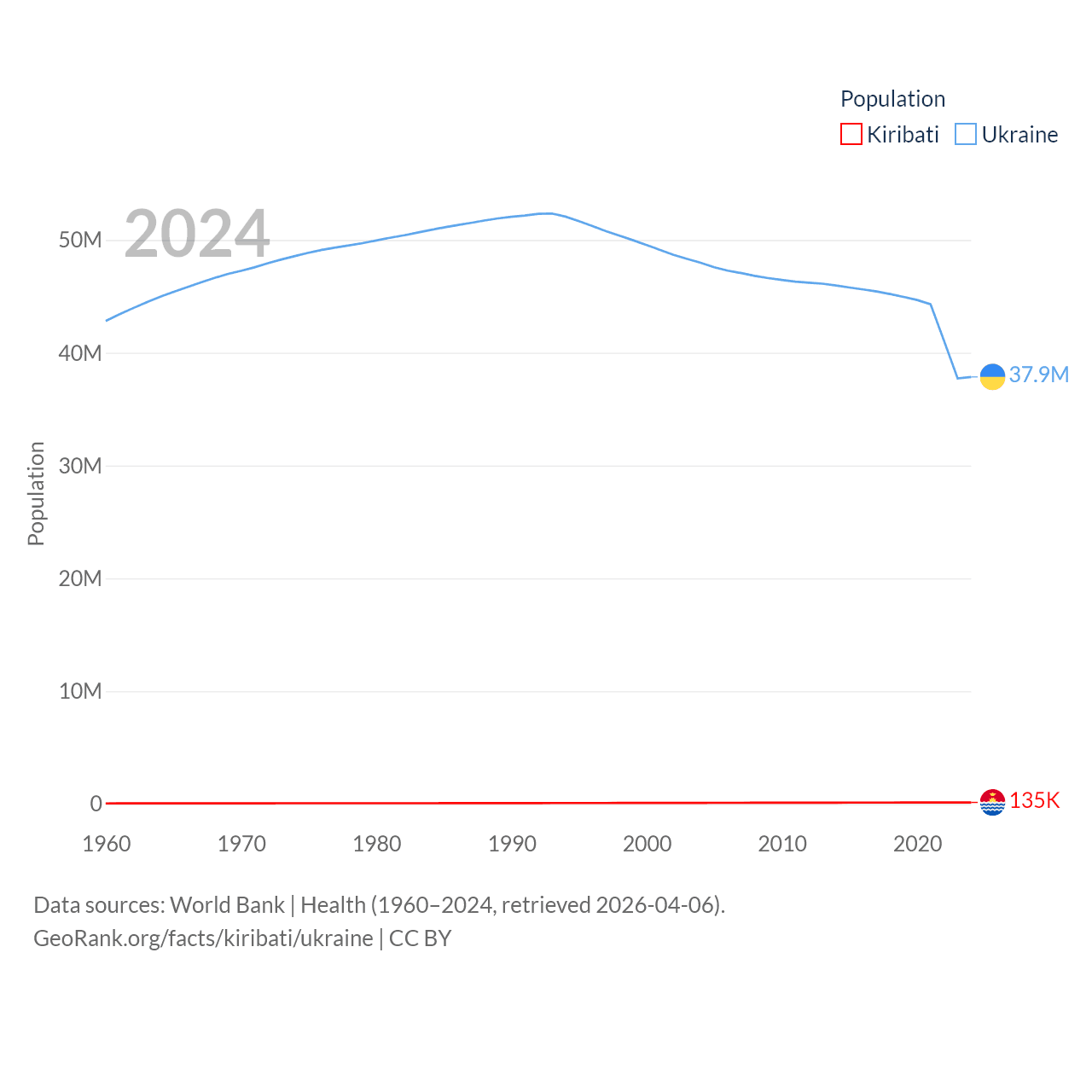 Kiribati has a population of 135K (ranked 180/197), compared with 37.9M in Ukraine (ranked 41/197). Kiribati's land area is 313 sq mi versus 223,708 sq mi for Ukraine (ranked 173rd vs. 46th).