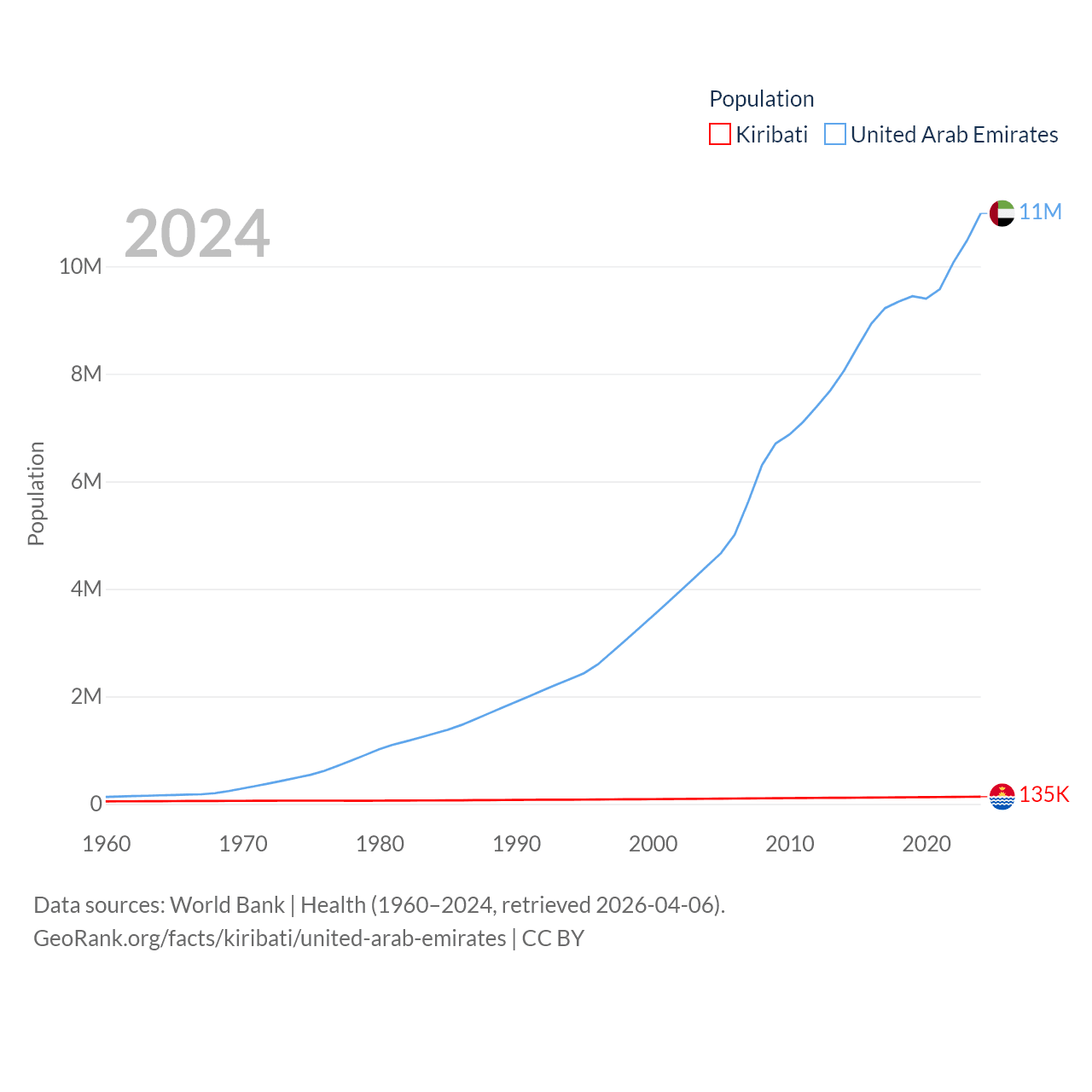 Kiribati has a population of 135K (ranked 180/197), compared with 11M in The United Arab Emirates (ranked 86/197). Kiribati's land area is 313 sq mi versus 27,421 sq mi for The United Arab Emirates (ranked 173rd vs. 117th).