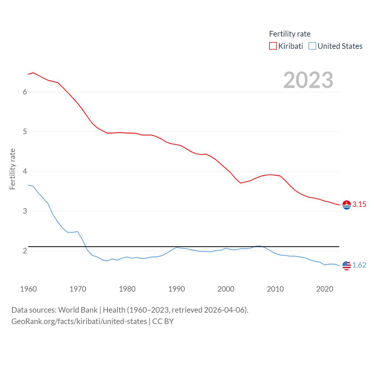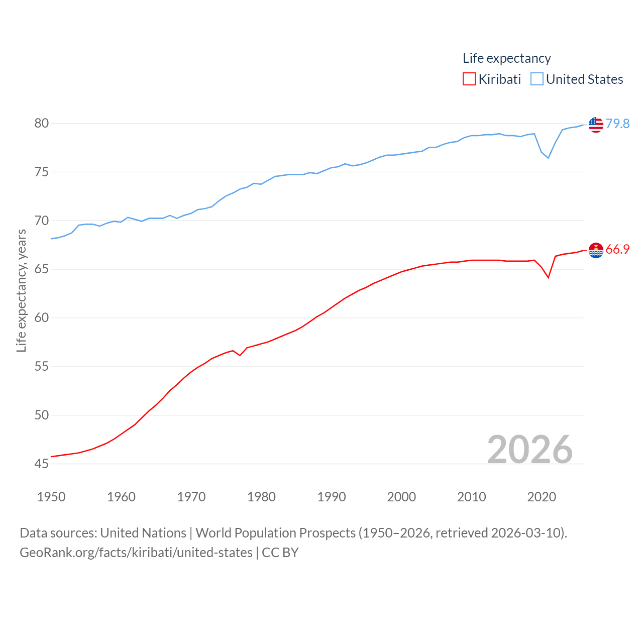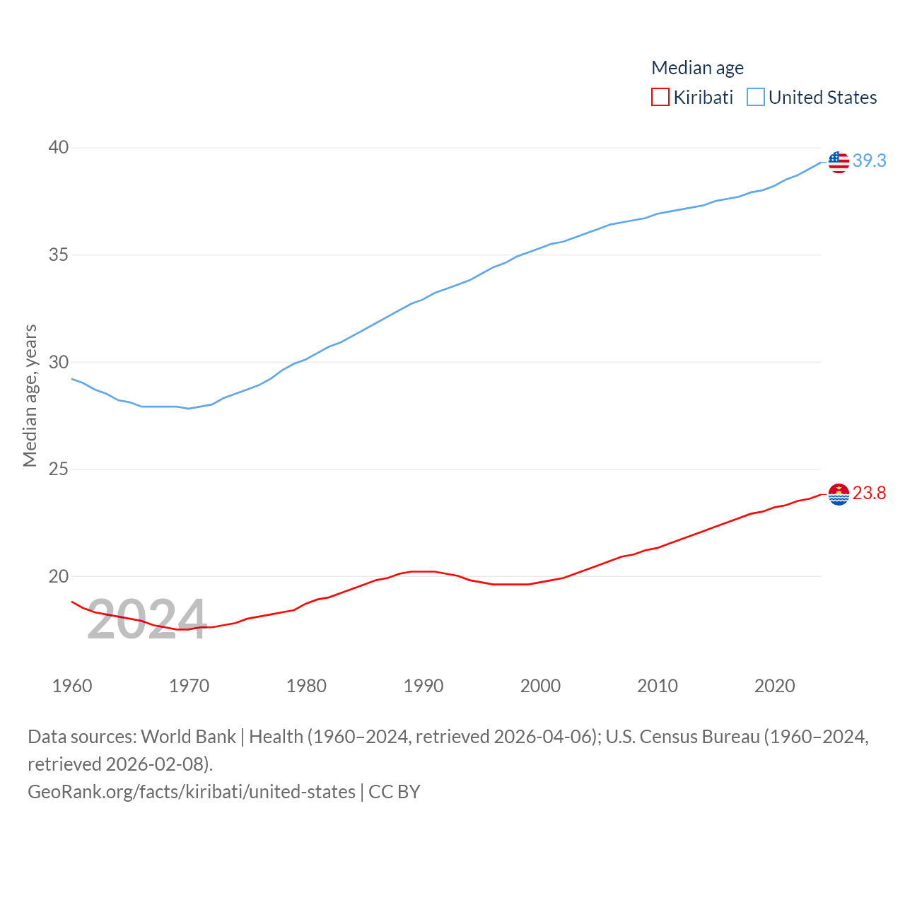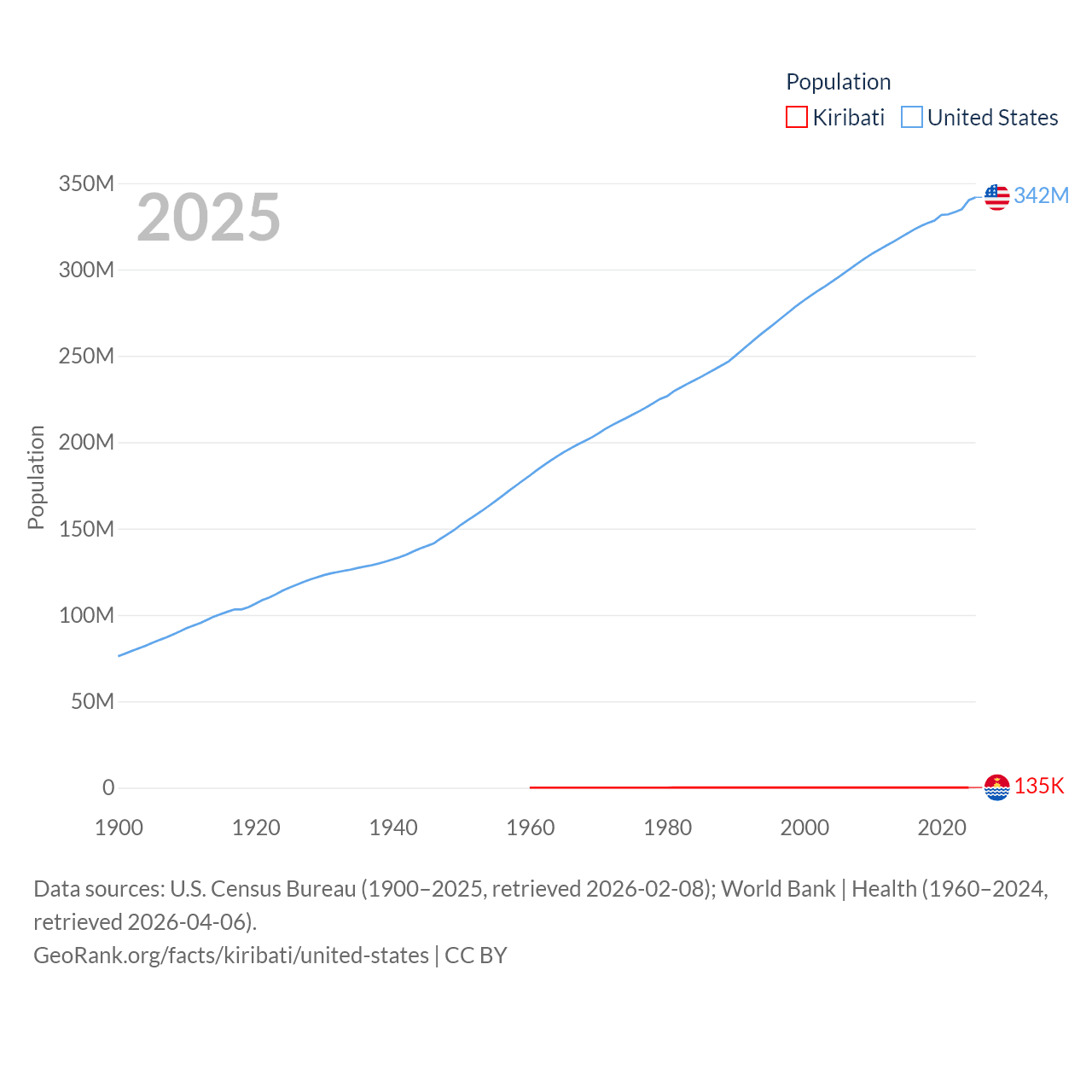 Kiribati has a population of 135K (ranked 180/197), compared with 342M in The United States (ranked 3/197). Kiribati's land area is 313 sq mi versus 3,531,839 sq mi for The United States (ranked 173rd vs. 3rd).