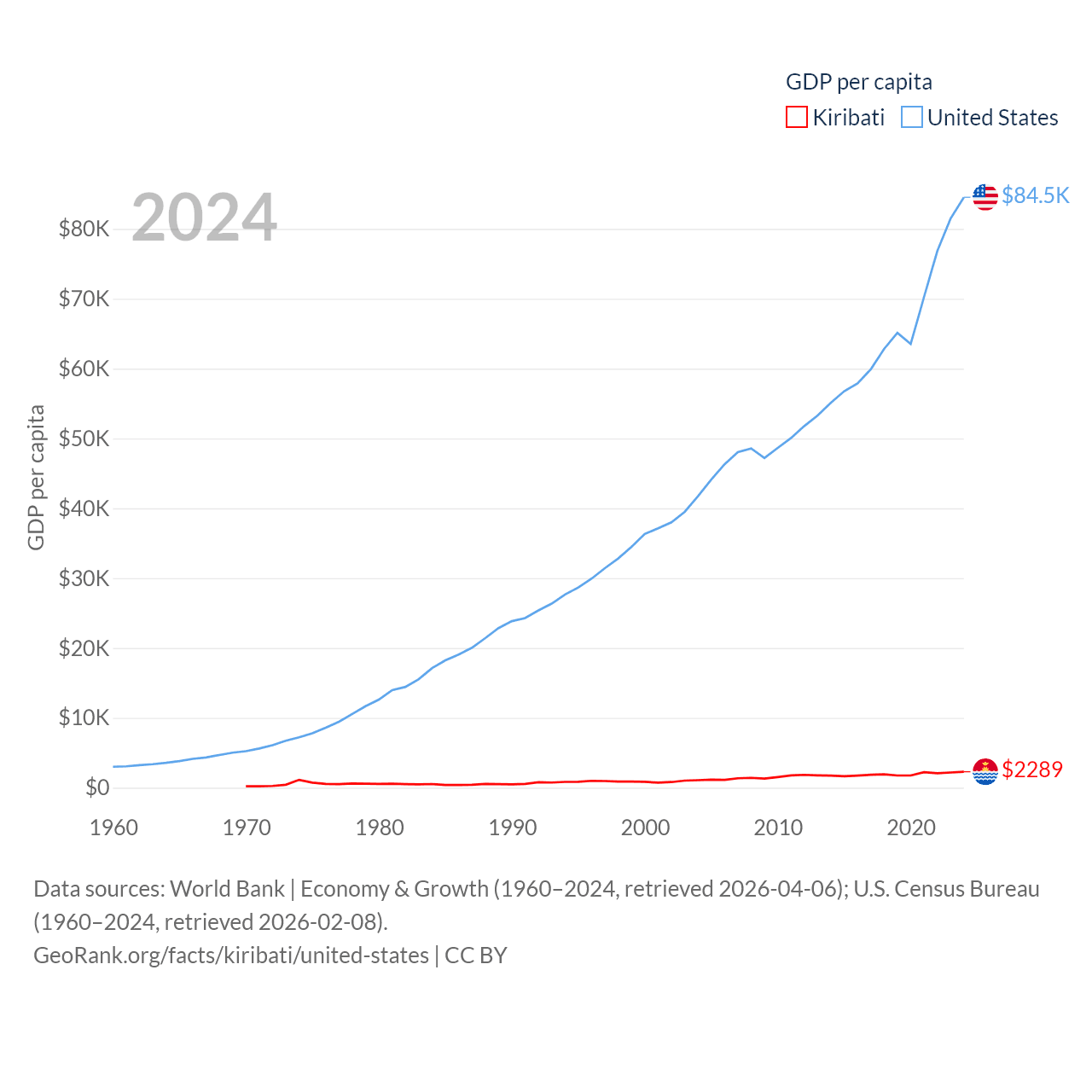 By GDP, Kiribati ranks 192/197 ($308M) and The United States ranks 1/197 ($28.8T). By GDP per capita, Kiribati ranks 152/197 ($2,289), while The United States ranks 10/197 ($84,534).
