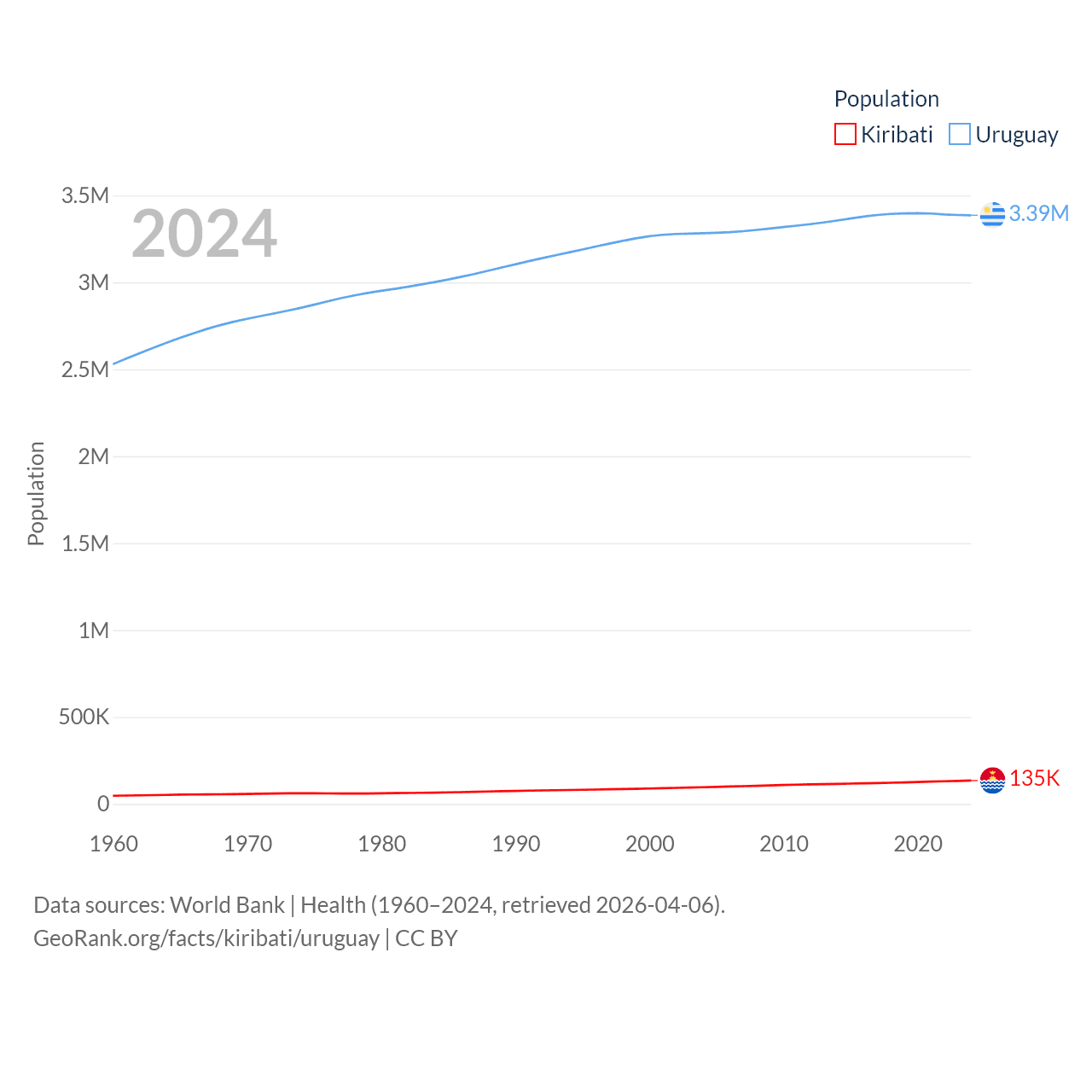 Kiribati has a population of 135K (ranked 180/197), compared with 3.39M in Uruguay (ranked 133/197). Kiribati's land area is 313 sq mi versus 67,576 sq mi for Uruguay (ranked 173rd vs. 89th).