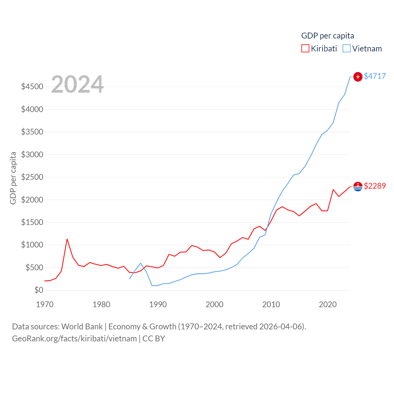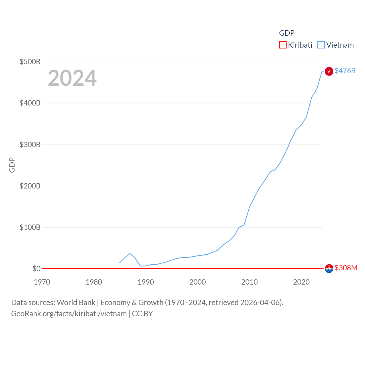 By GDP, Kiribati ranks 192/197 ($308M) and Vietnam ranks 33/197 ($476B). By GDP per capita, Kiribati ranks 152/197 ($2,289), while Vietnam ranks 122/197 ($4,717).