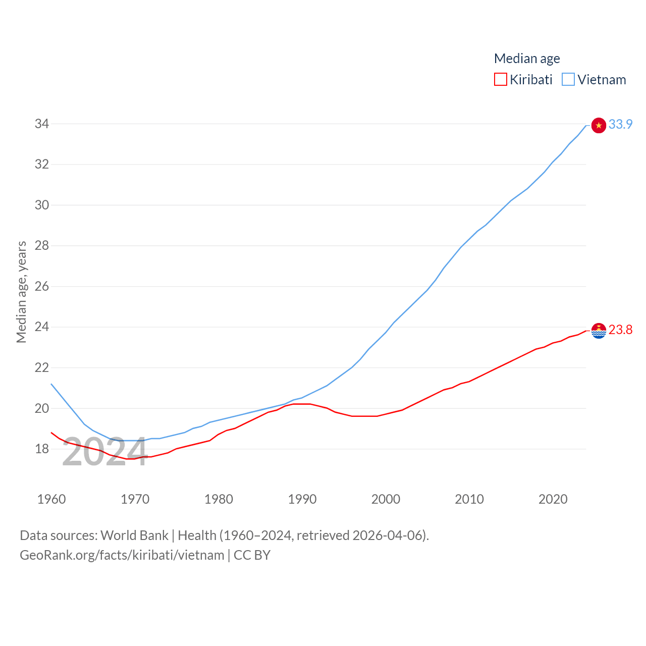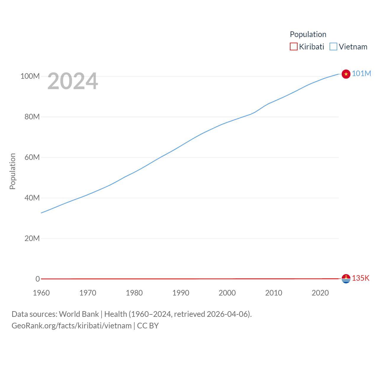 Kiribati has a population of 135K (ranked 180/197), compared with 101M in Vietnam (ranked 16/197). Kiribati's land area is 313 sq mi versus 121,016 sq mi for Vietnam (ranked 173rd vs. 67th).