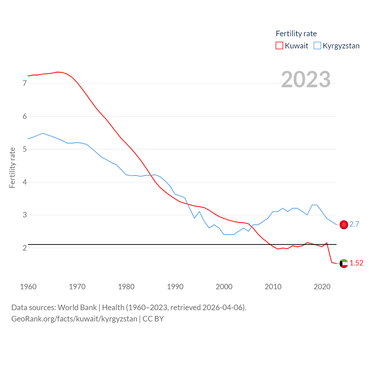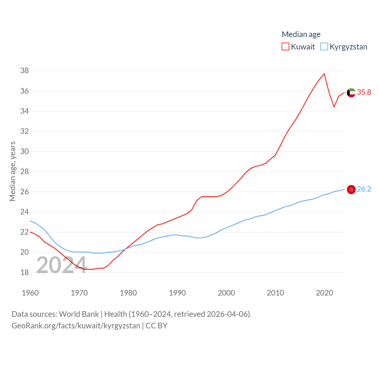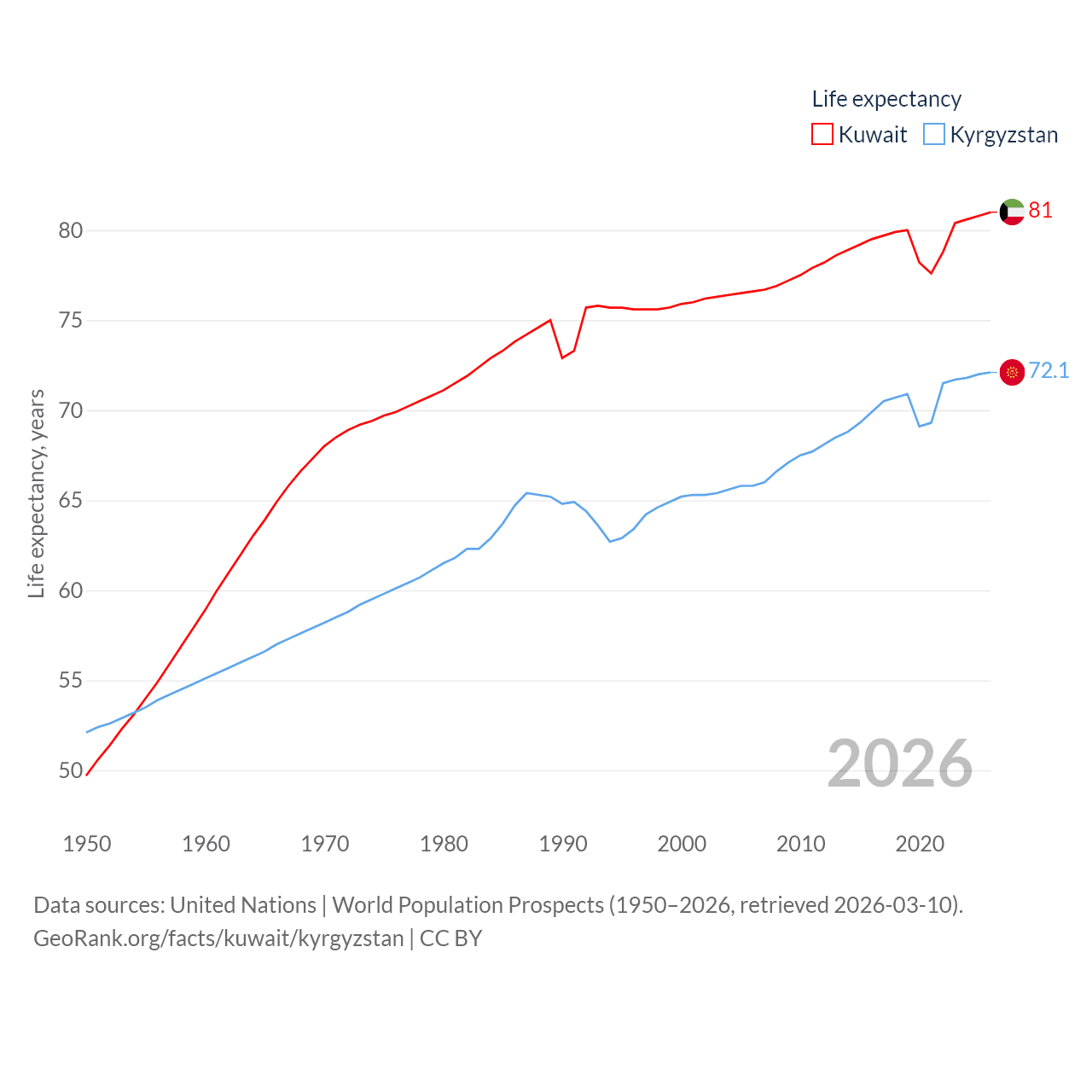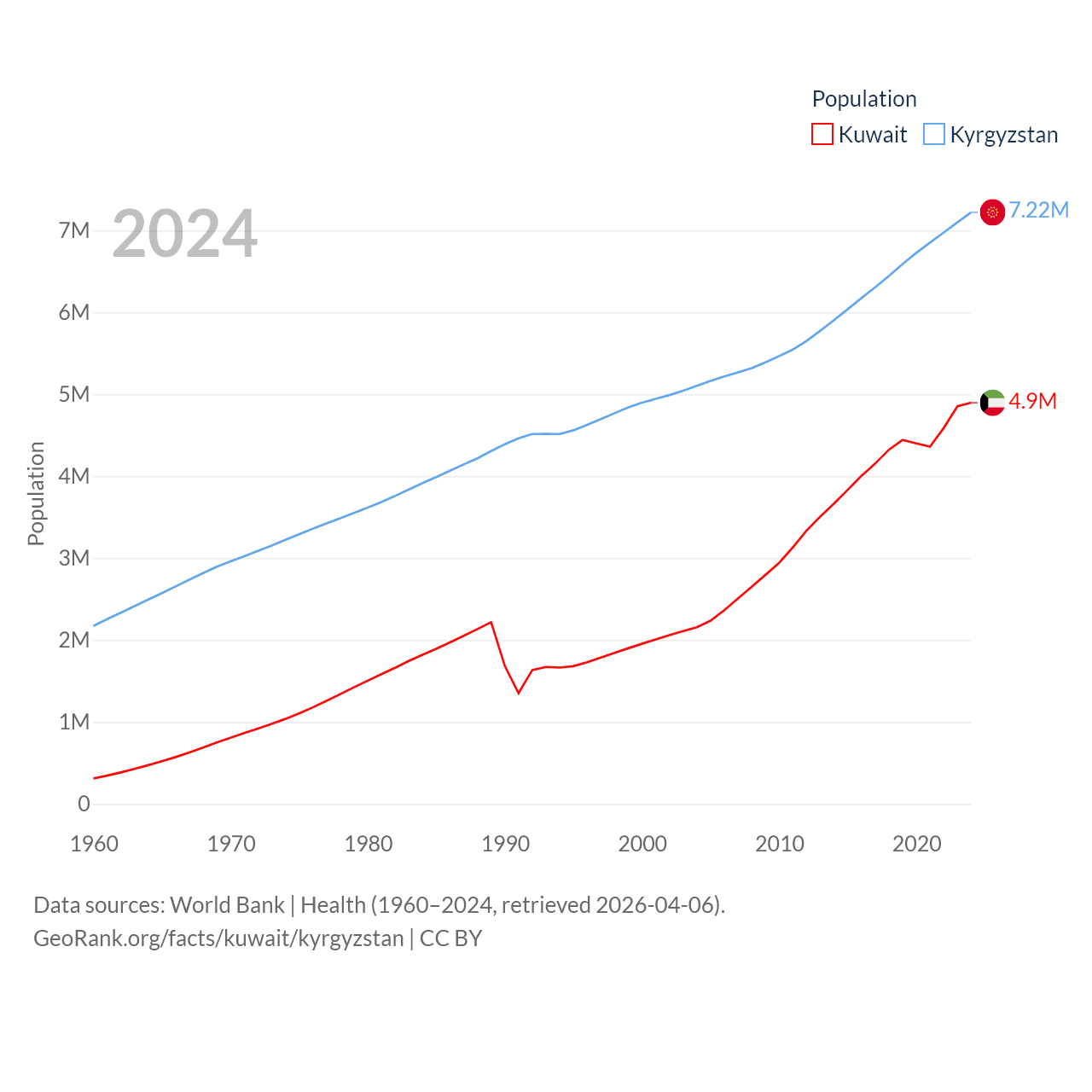 Kuwait has a population of 4.9M (ranked 127/197), compared with 7.22M in Kyrgyzstan (ranked 106/197). Kuwait's land area is 6,880 sq mi versus 74,054 sq mi for Kyrgyzstan (ranked 153rd vs. 86th).