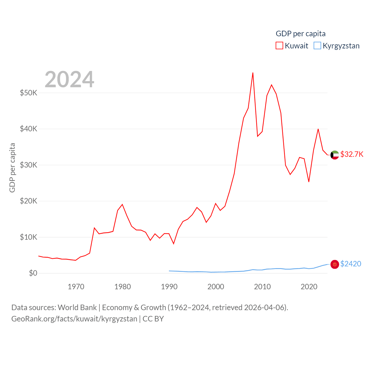 By GDP, Kuwait ranks 59/197 ($160B) and Kyrgyzstan ranks 135/197 ($17.5B). By GDP per capita, Kuwait ranks 37/197 ($32,718), while Kyrgyzstan ranks 150/197 ($2,420).