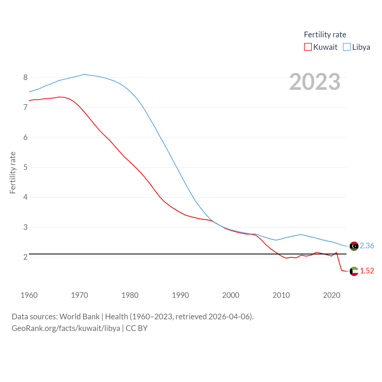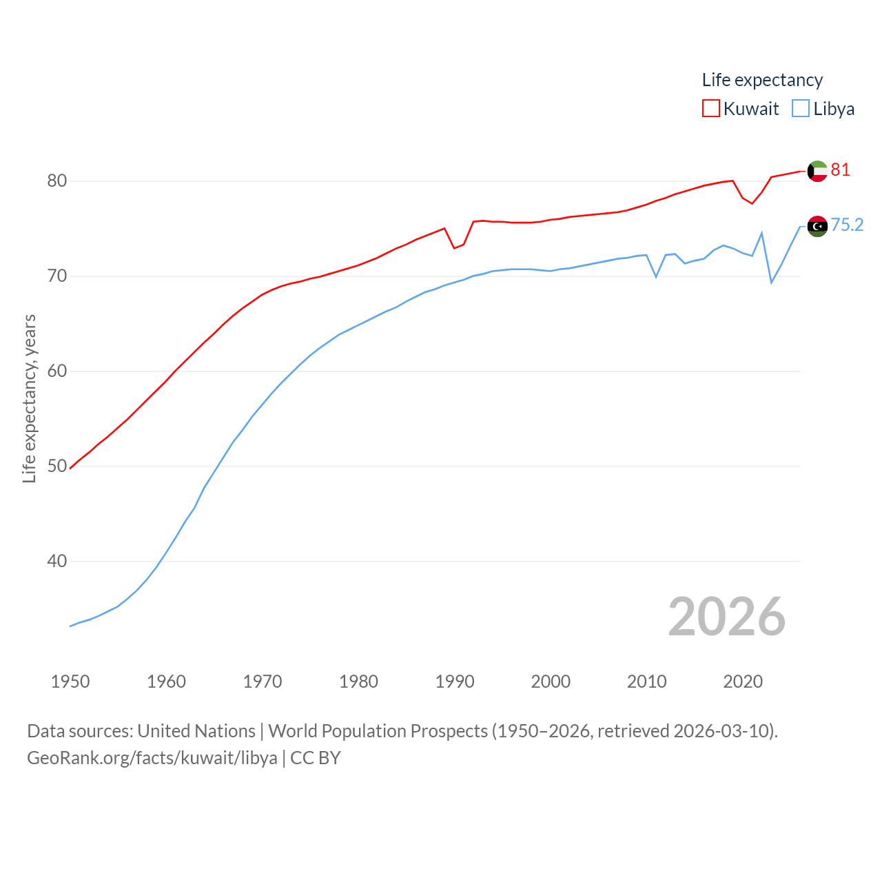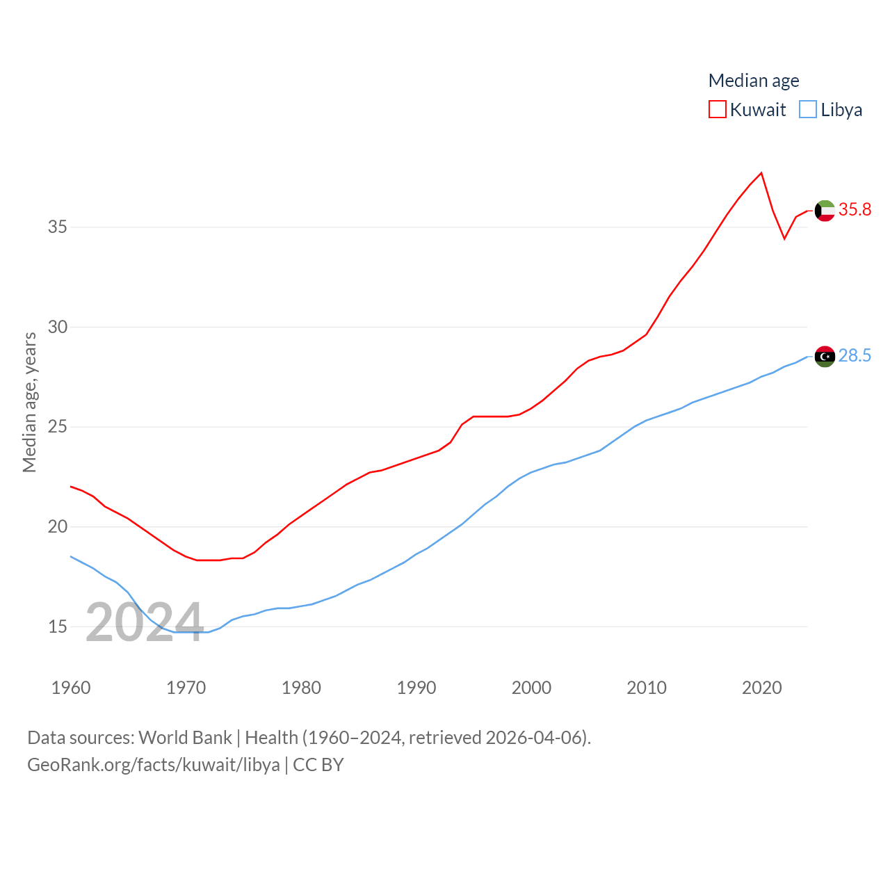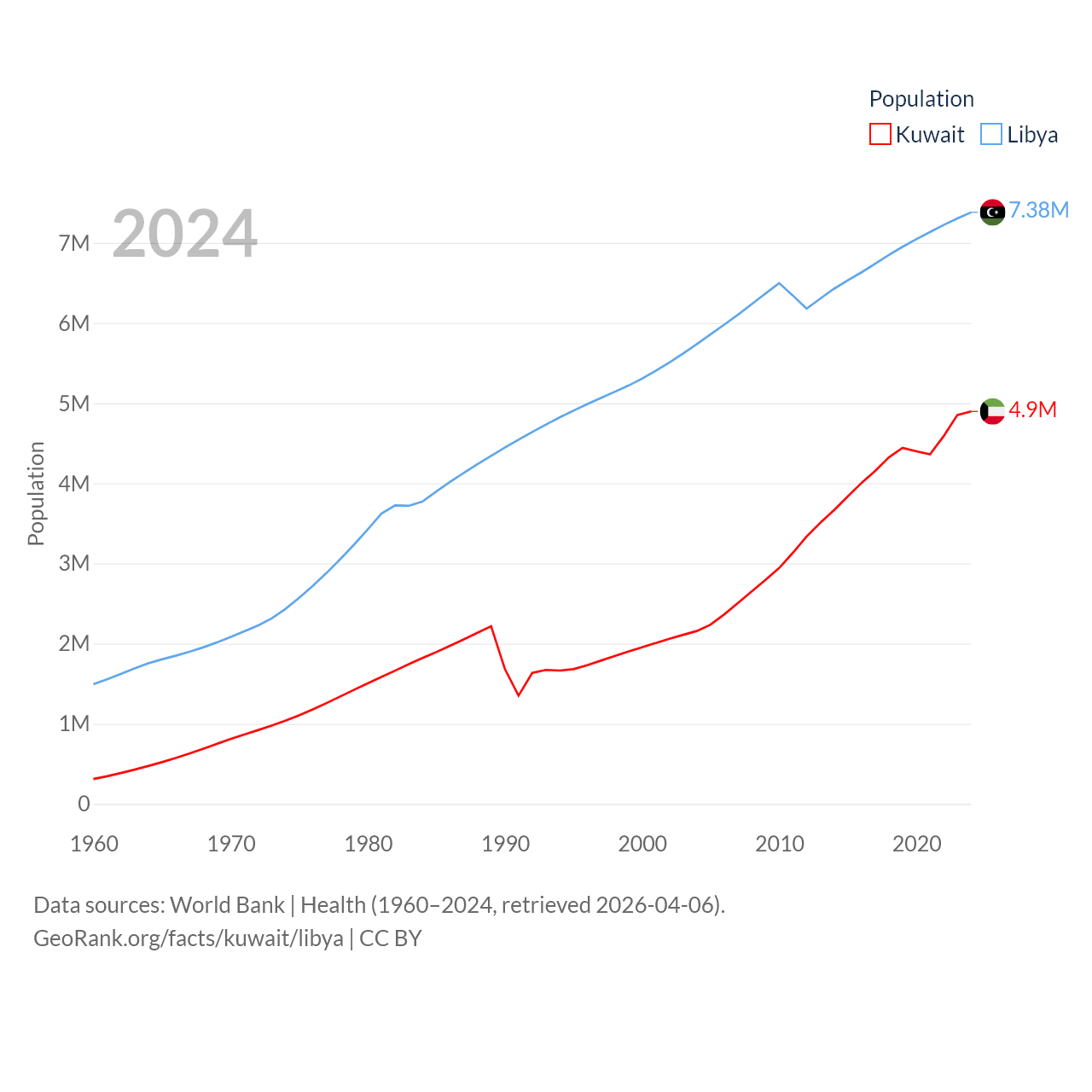 Kuwait has a population of 4.9M (ranked 127/197), compared with 7.38M in Libya (ranked 105/197). Kuwait's land area is 6,880 sq mi versus 679,362 sq mi for Libya (ranked 153rd vs. 16th).