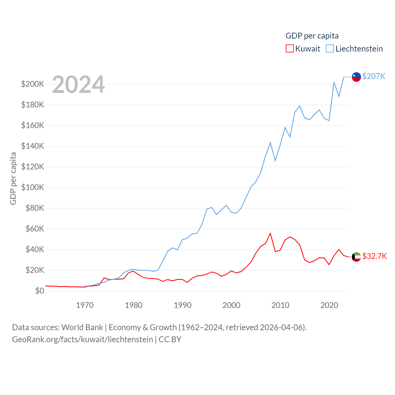 By GDP, Kuwait ranks 59/197 ($160B) and Liechtenstein ranks 156/197 ($8.24B). By GDP per capita, Kuwait ranks 37/197 ($32,718), while Liechtenstein ranks 2/197 ($206,781).