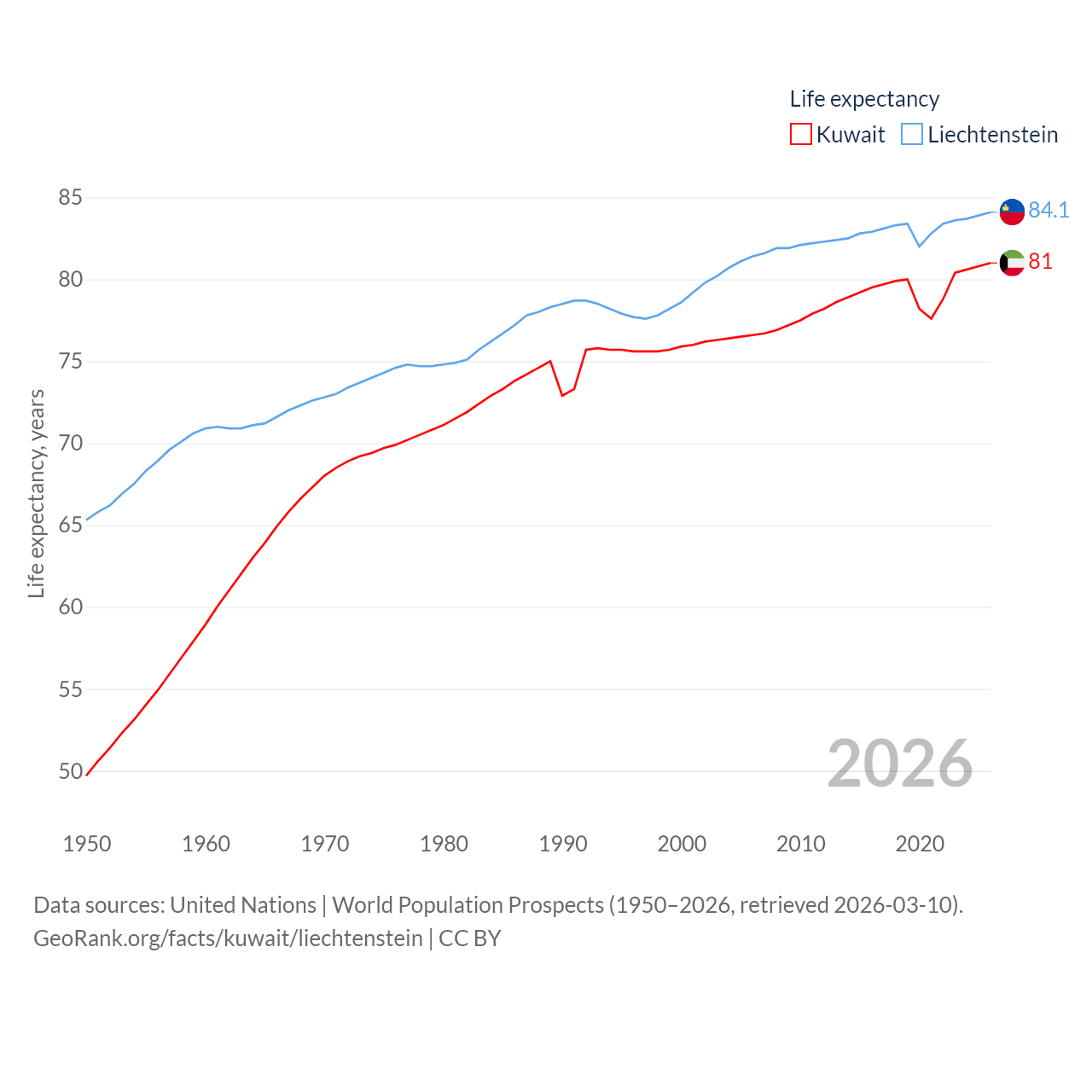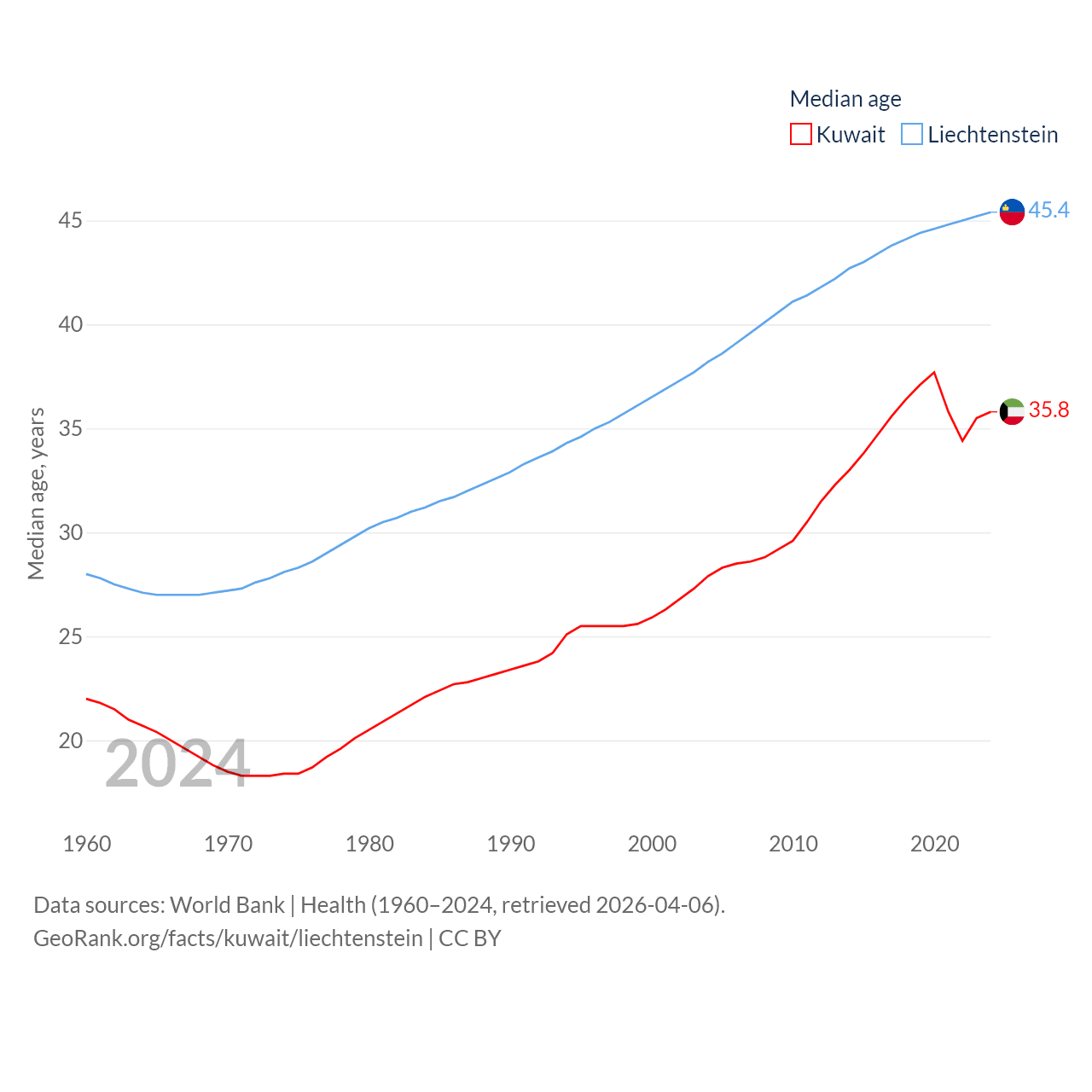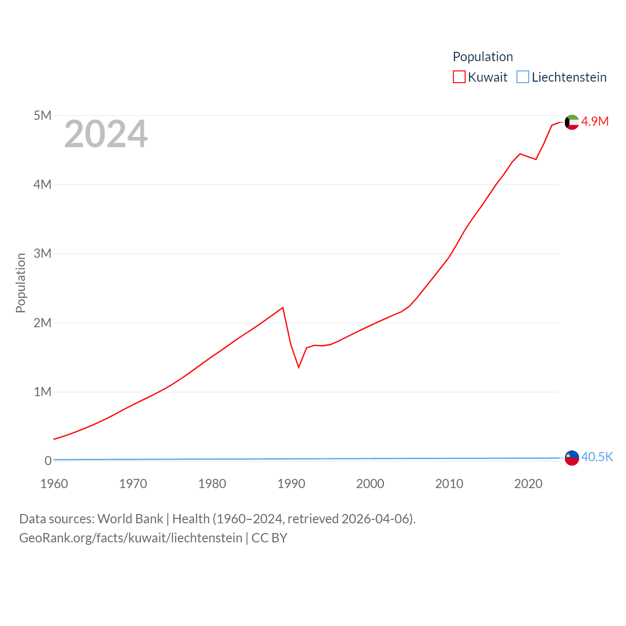 Kuwait has a population of 4.9M (ranked 127/197), compared with 40.4K in Liechtenstein (ranked 190/197). Kuwait's land area is 6,880 sq mi versus 61.8 sq mi for Liechtenstein (ranked 153rd vs. 192nd).