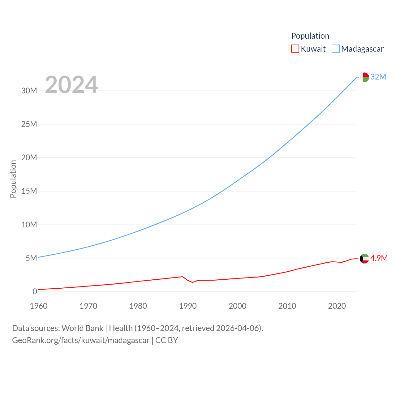 Kuwait has a population of 4.9M (ranked 127/197), compared with 32M in Madagascar (ranked 49/197). Kuwait's land area is 6,880 sq mi versus 224,634 sq mi for Madagascar (ranked 153rd vs. 44th).
