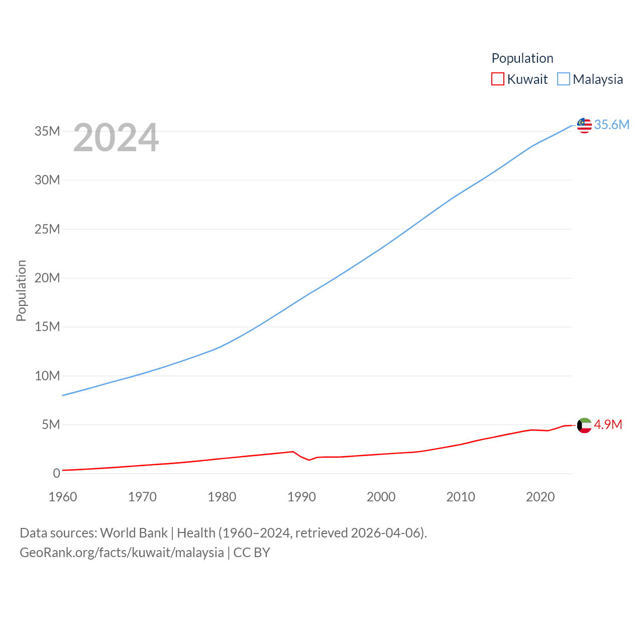 Kuwait has a population of 4.9M (ranked 127/197), compared with 35.6M in Malaysia (ranked 44/197). Kuwait's land area is 6,880 sq mi versus 126,854 sq mi for Malaysia (ranked 153rd vs. 65th).