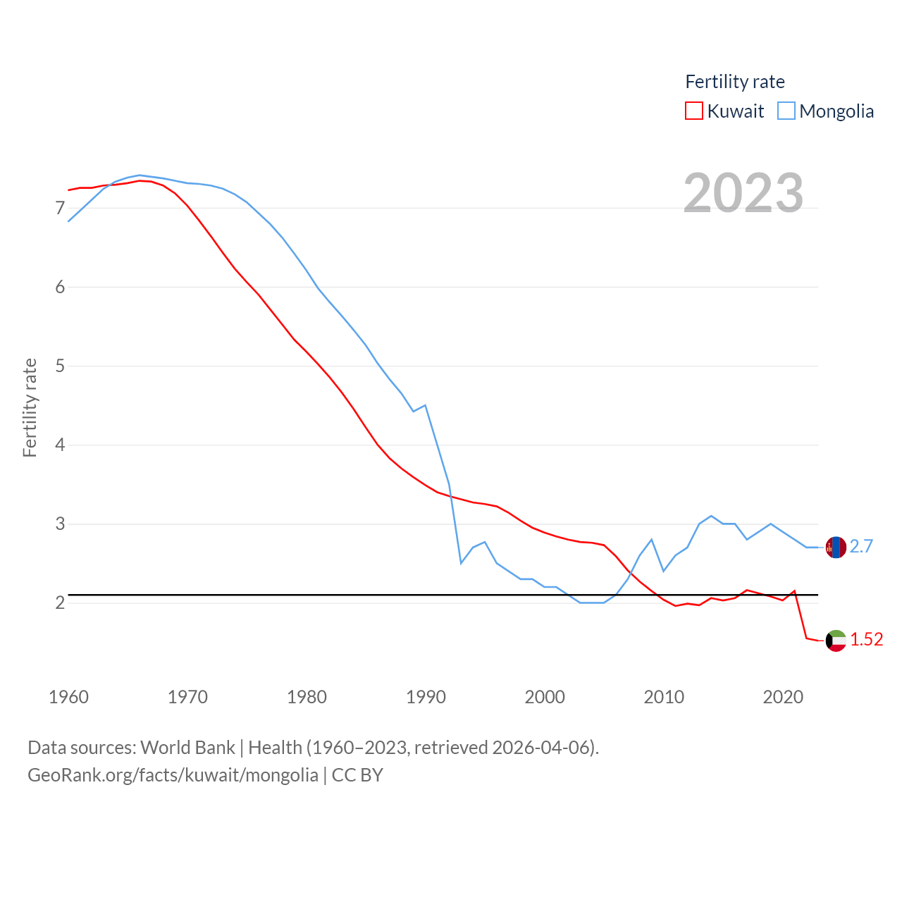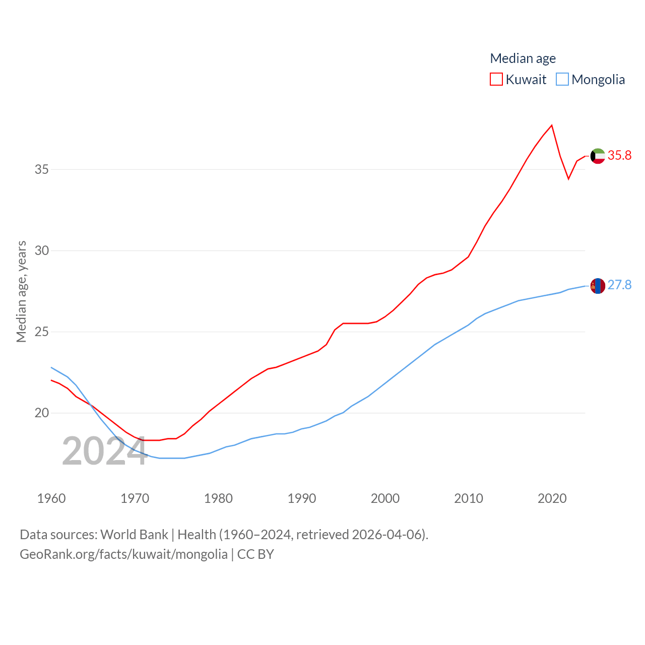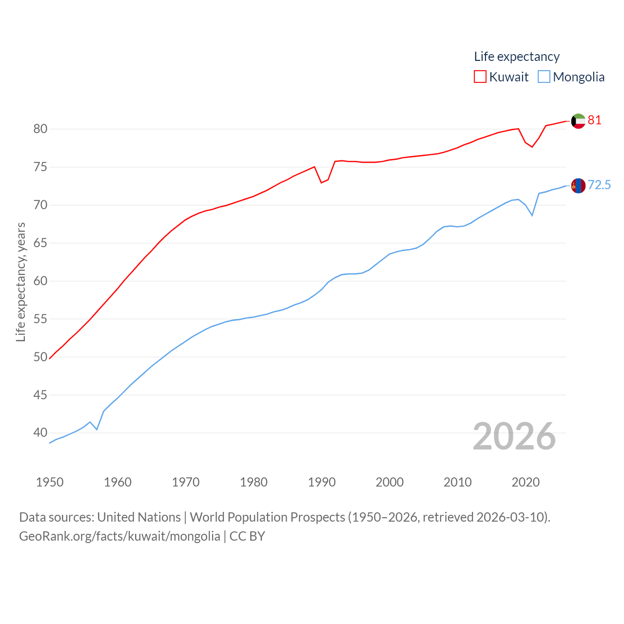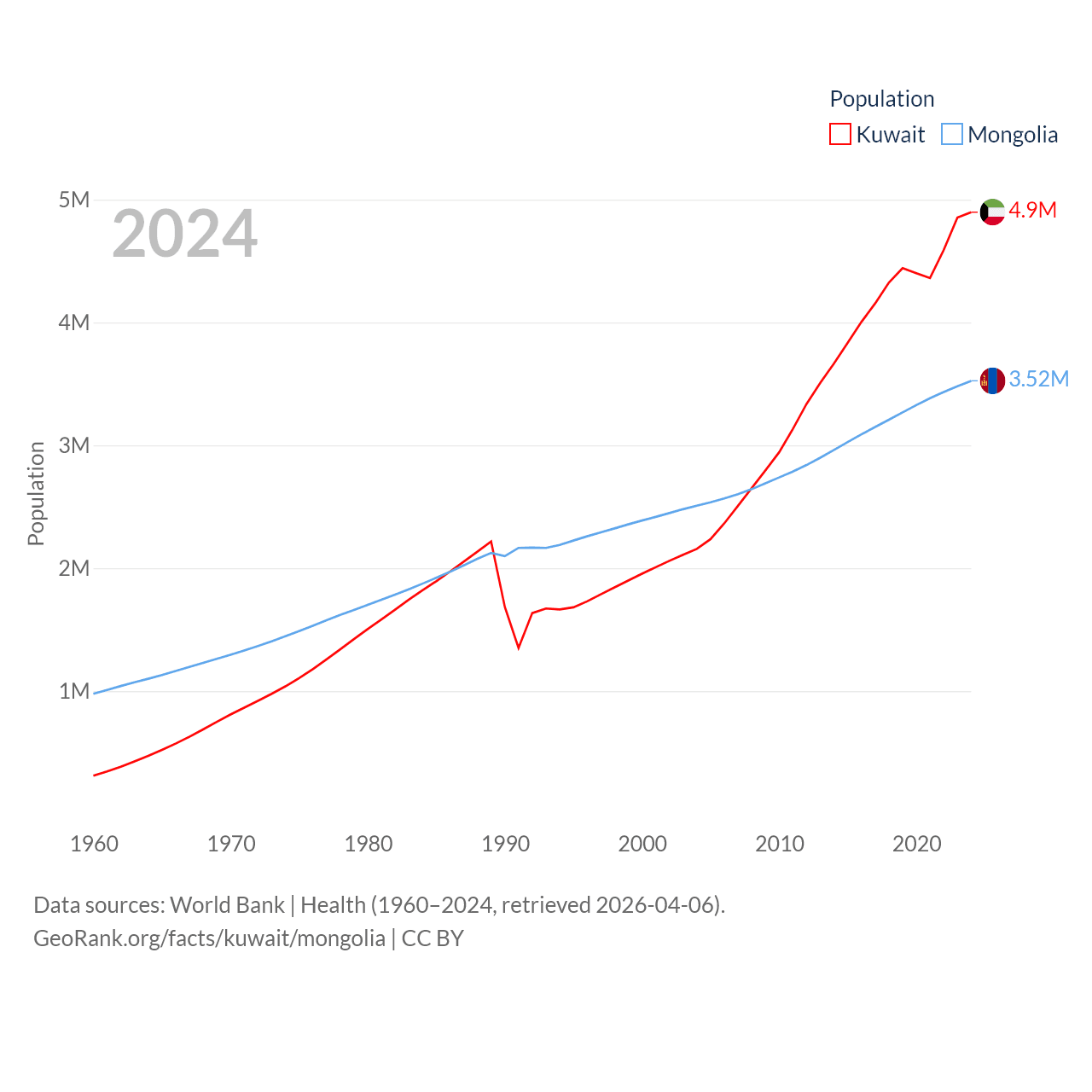 Kuwait has a population of 4.9M (ranked 127/197), compared with 3.52M in Mongolia (ranked 132/197). Kuwait's land area is 6,880 sq mi versus 601,740 sq mi for Mongolia (ranked 153rd vs. 18th).