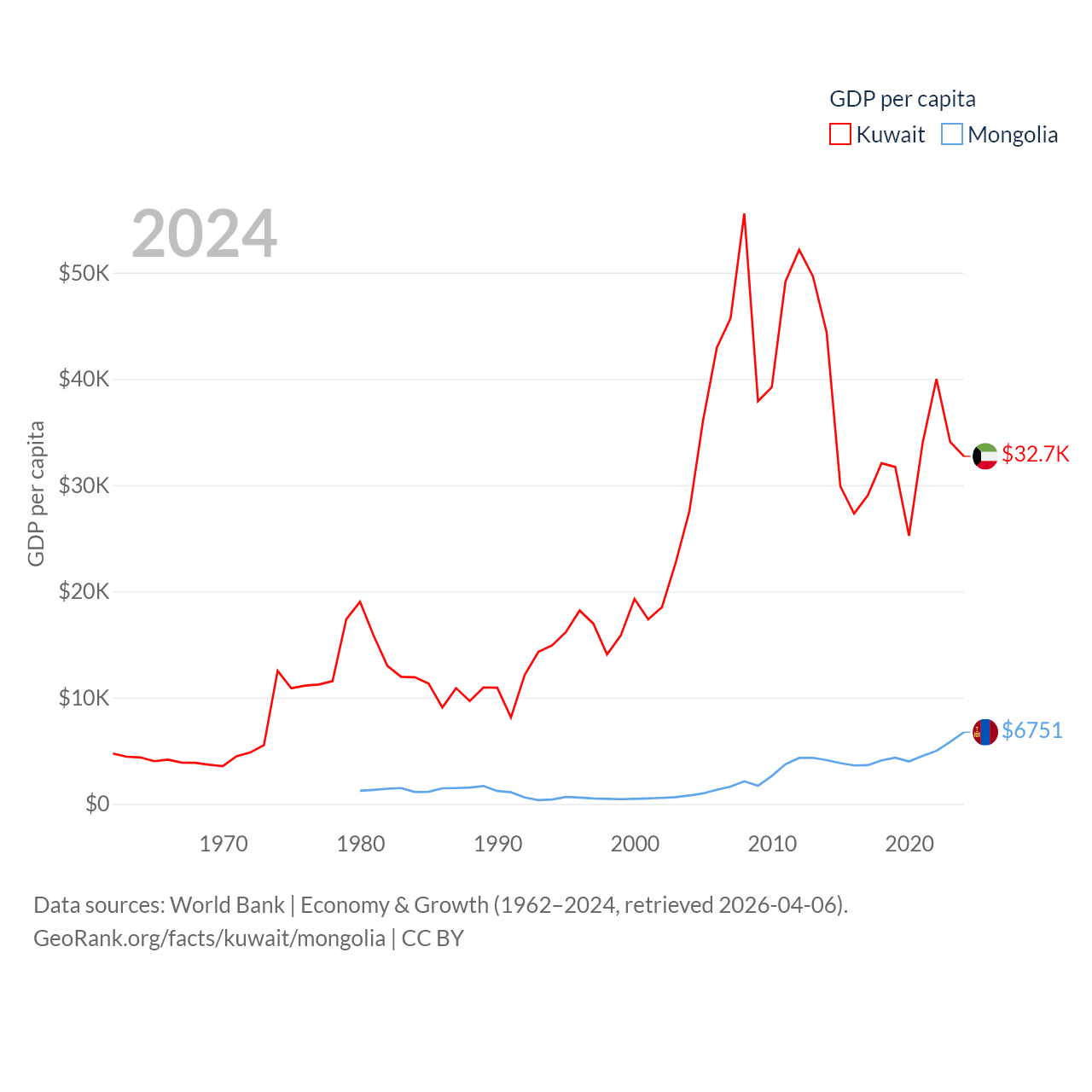 By GDP, Kuwait ranks 59/197 ($160B) and Mongolia ranks 121/197 ($23.8B). By GDP per capita, Kuwait ranks 37/197 ($32,718), while Mongolia ranks 105/197 ($6,751).