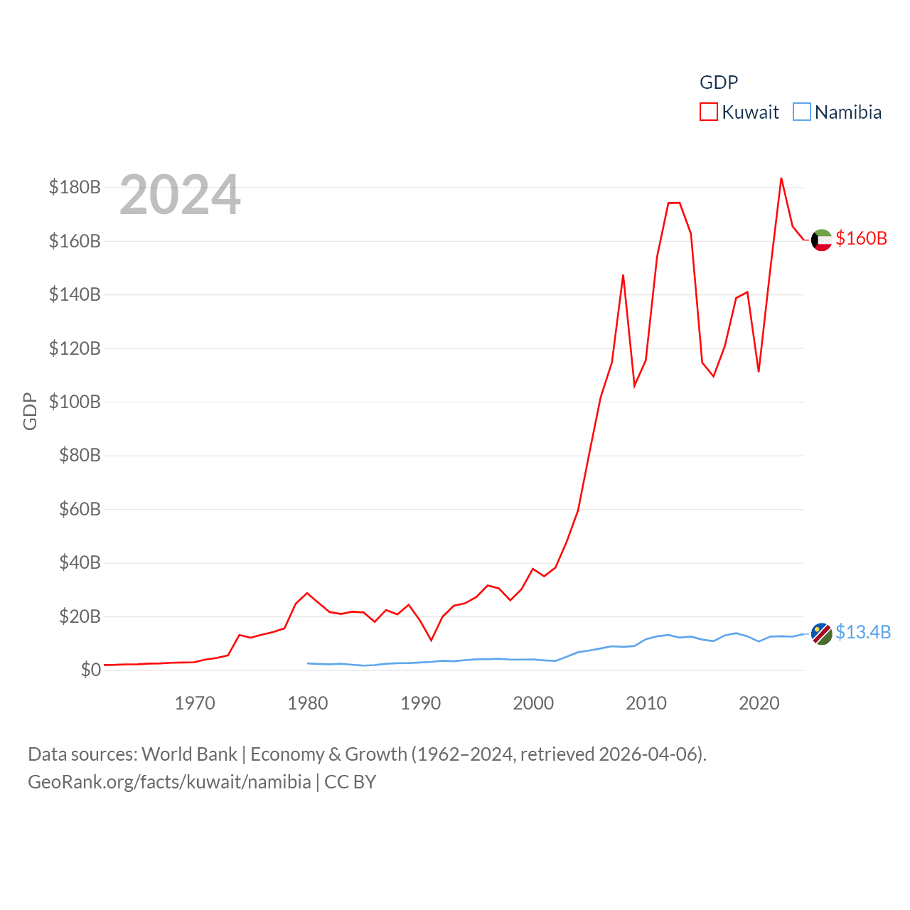 By GDP, Kuwait ranks 59/197 ($160B) and Namibia ranks 147/197 ($13.4B). By GDP per capita, Kuwait ranks 37/197 ($32,718), while Namibia ranks 126/197 ($4,413).