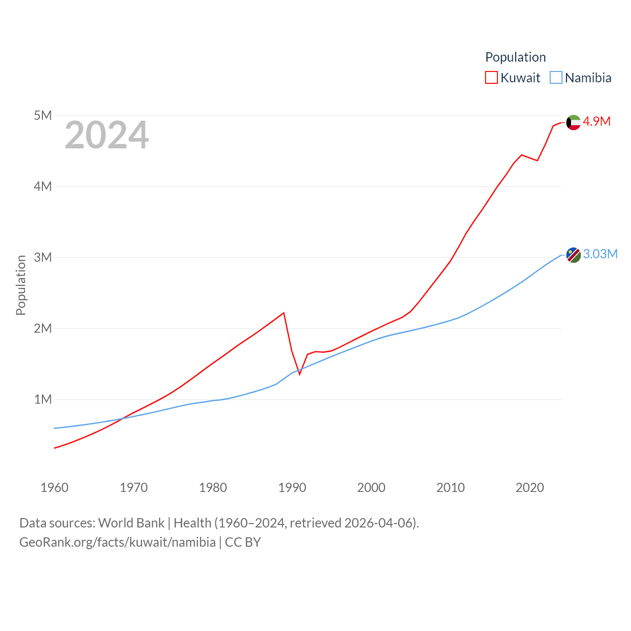 Kuwait has a population of 4.9M (ranked 127/197), compared with 3.03M in Namibia (ranked 136/197). Kuwait's land area is 6,880 sq mi versus 317,874 sq mi for Namibia (ranked 153rd vs. 33rd).