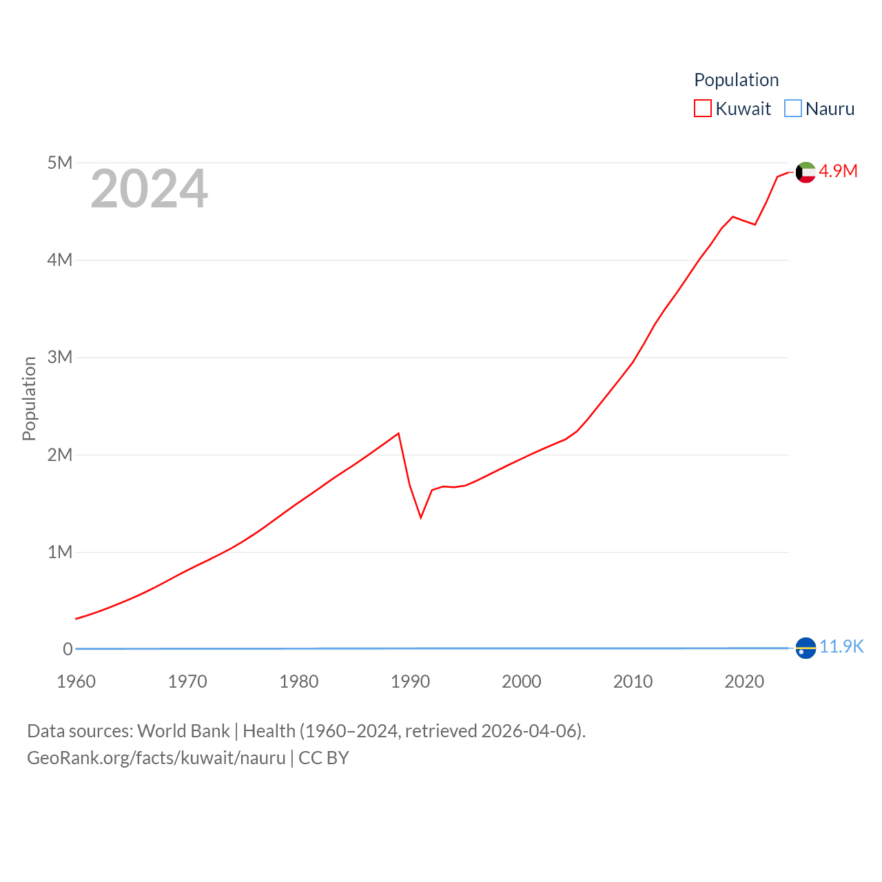 Kuwait has a population of 4.9M (ranked 127/197), compared with 11.9K in Nauru (ranked 195/197). Kuwait's land area is 6,880 sq mi versus 7.72 sq mi for Nauru (ranked 153rd vs. 195th).