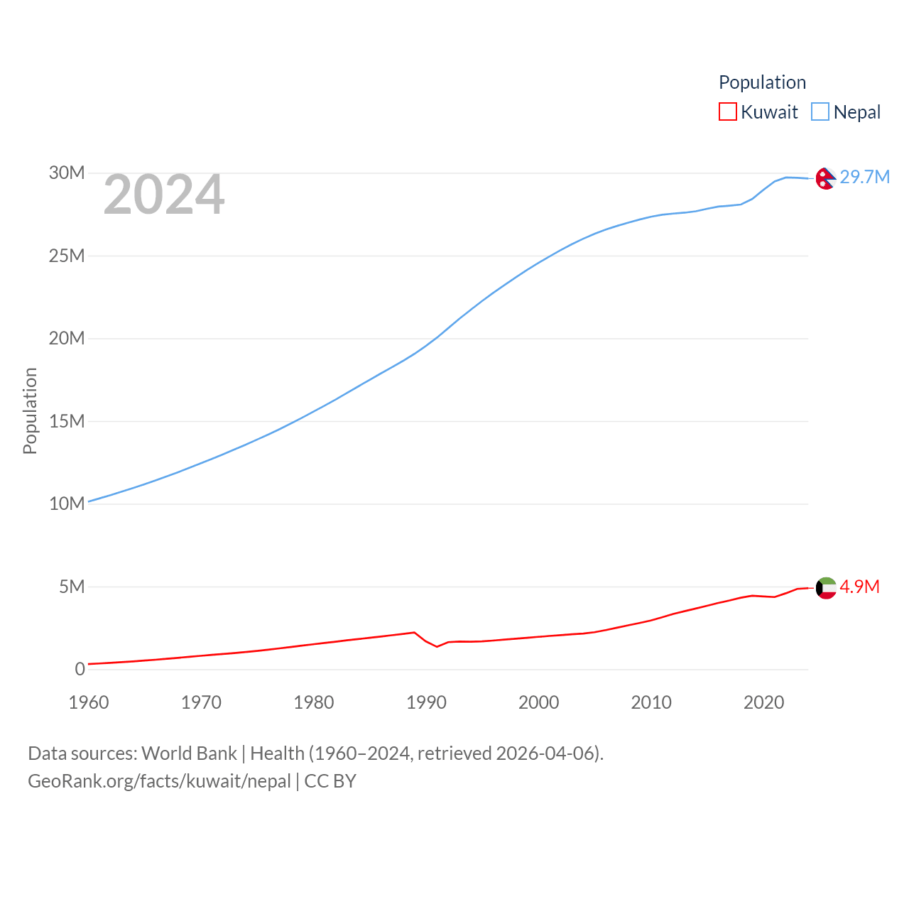 Kuwait has a population of 4.9M (ranked 127/197), compared with 29.7M in Nepal (ranked 51/197). Kuwait's land area is 6,880 sq mi versus 55,348 sq mi for Nepal (ranked 153rd vs. 92nd).