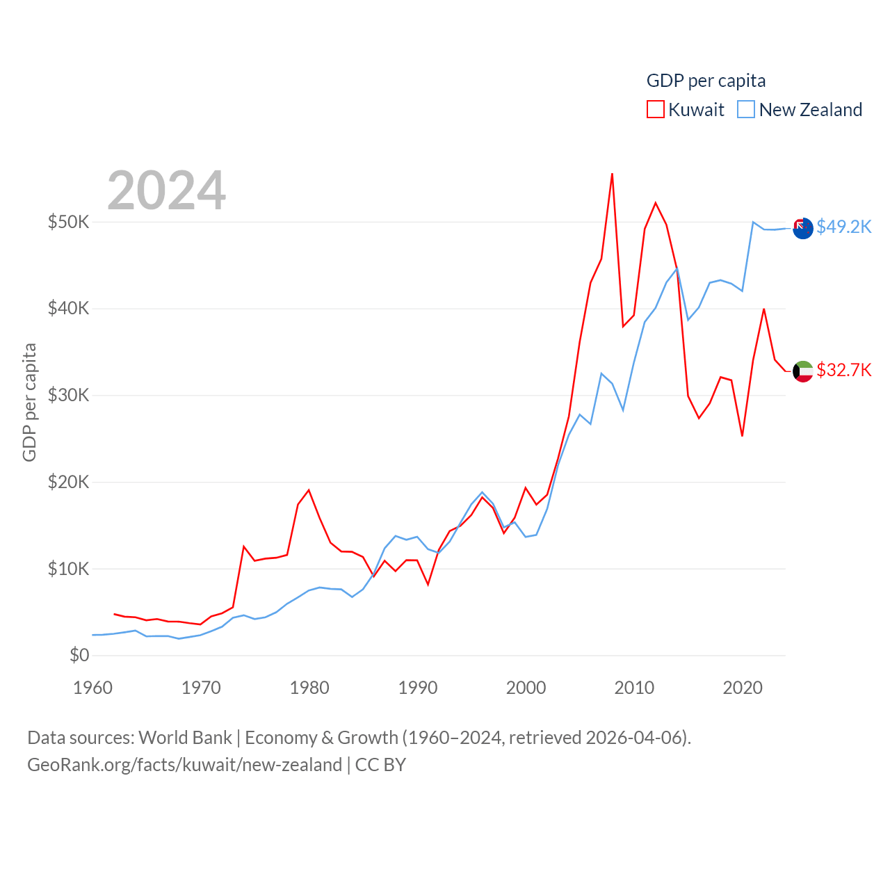 By GDP, Kuwait ranks 59/197 ($160B) and New Zealand ranks 52/197 ($260B). By GDP per capita, Kuwait ranks 37/197 ($32,718), while New Zealand ranks 26/197 ($49,205).
