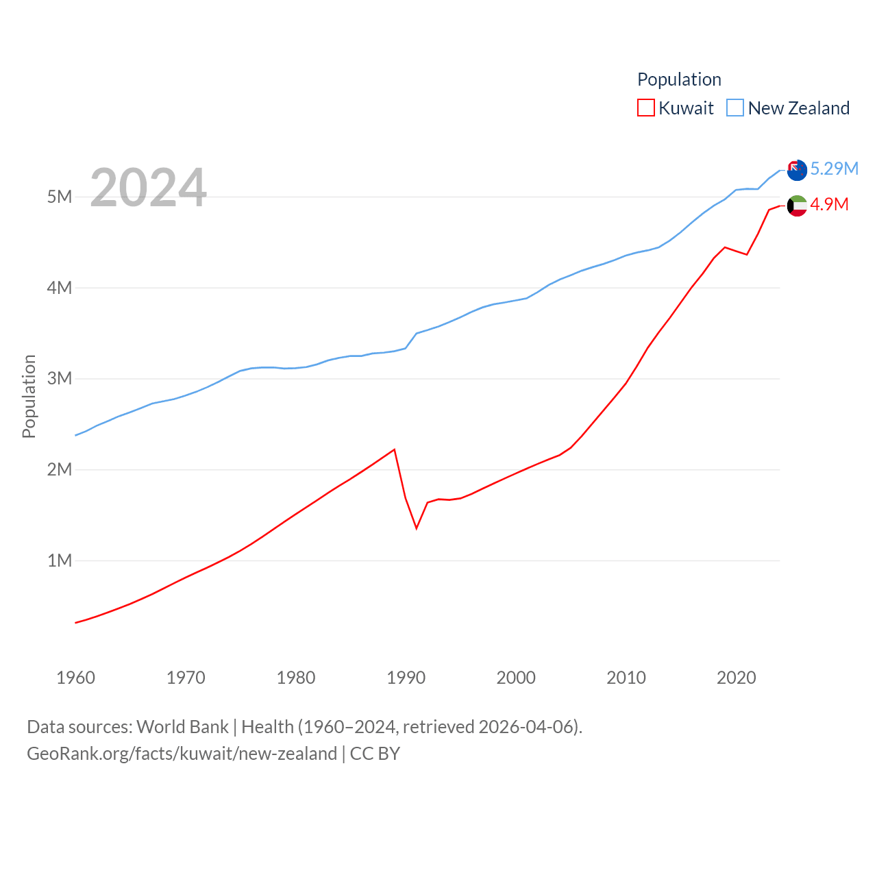 Kuwait has a population of 4.9M (ranked 127/197), compared with 5.29M in New Zealand (ranked 123/197). Kuwait's land area is 6,880 sq mi versus 101,665 sq mi for New Zealand (ranked 153rd vs. 74th).