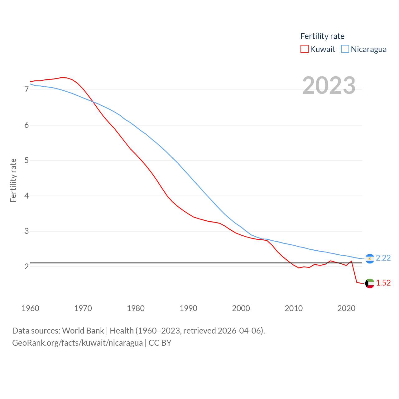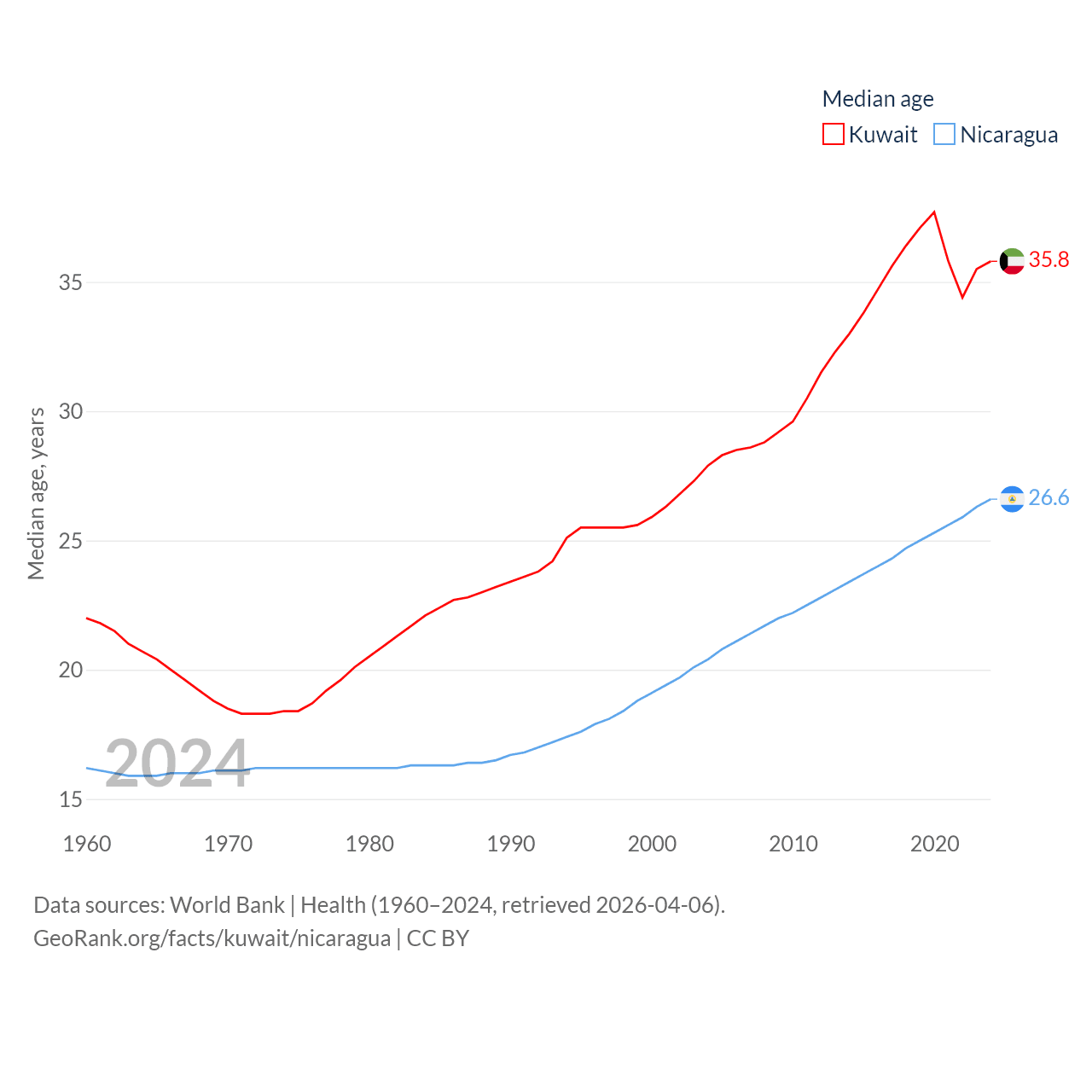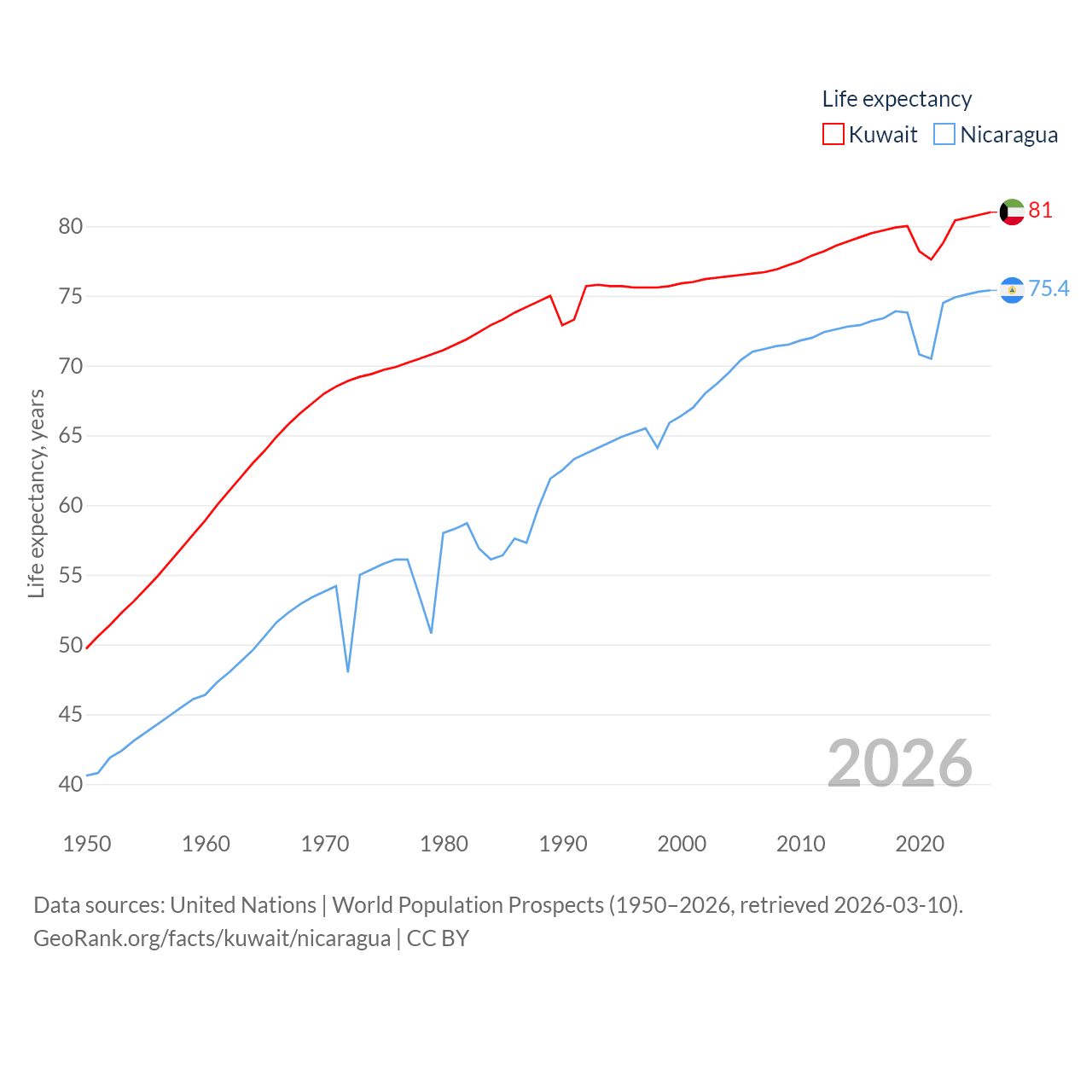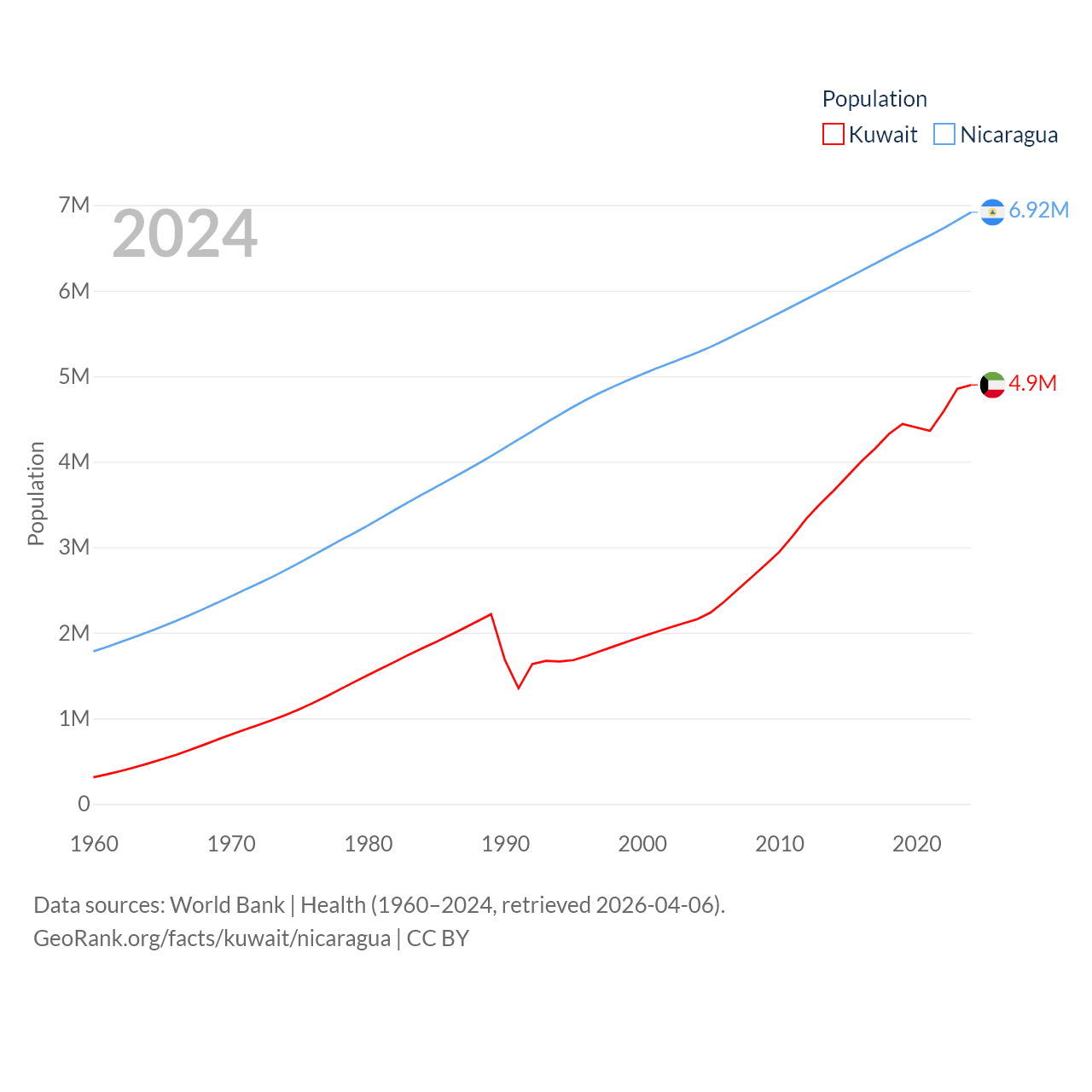 Kuwait has a population of 4.9M (ranked 127/197), compared with 6.92M in Nicaragua (ranked 108/197). Kuwait's land area is 6,880 sq mi versus 46,464 sq mi for Nicaragua (ranked 153rd vs. 98th).