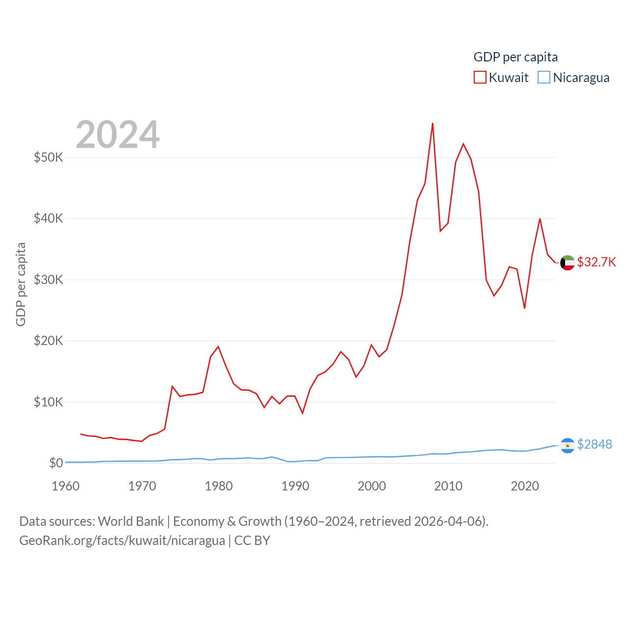 By GDP, Kuwait ranks 59/197 ($160B) and Nicaragua ranks 131/197 ($19.7B). By GDP per capita, Kuwait ranks 37/197 ($32,718), while Nicaragua ranks 141/197 ($2,848).
