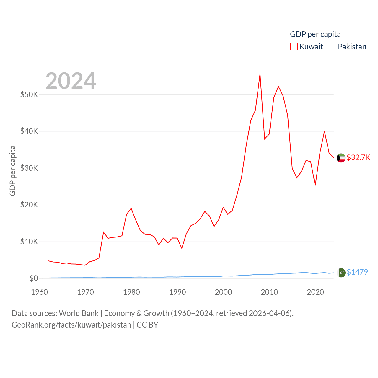 By GDP, Kuwait ranks 59/197 ($160B) and Pakistan ranks 43/197 ($372B). By GDP per capita, Kuwait ranks 37/197 ($32,718), while Pakistan ranks 163/197 ($1,479).