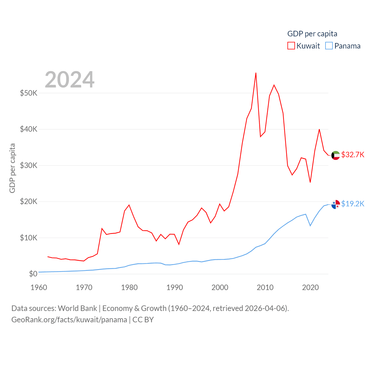 By GDP, Kuwait ranks 59/197 ($160B) and Panama ranks 78/197 ($86.5B). By GDP per capita, Kuwait ranks 37/197 ($32,718), while Panama ranks 60/197 ($19,161).