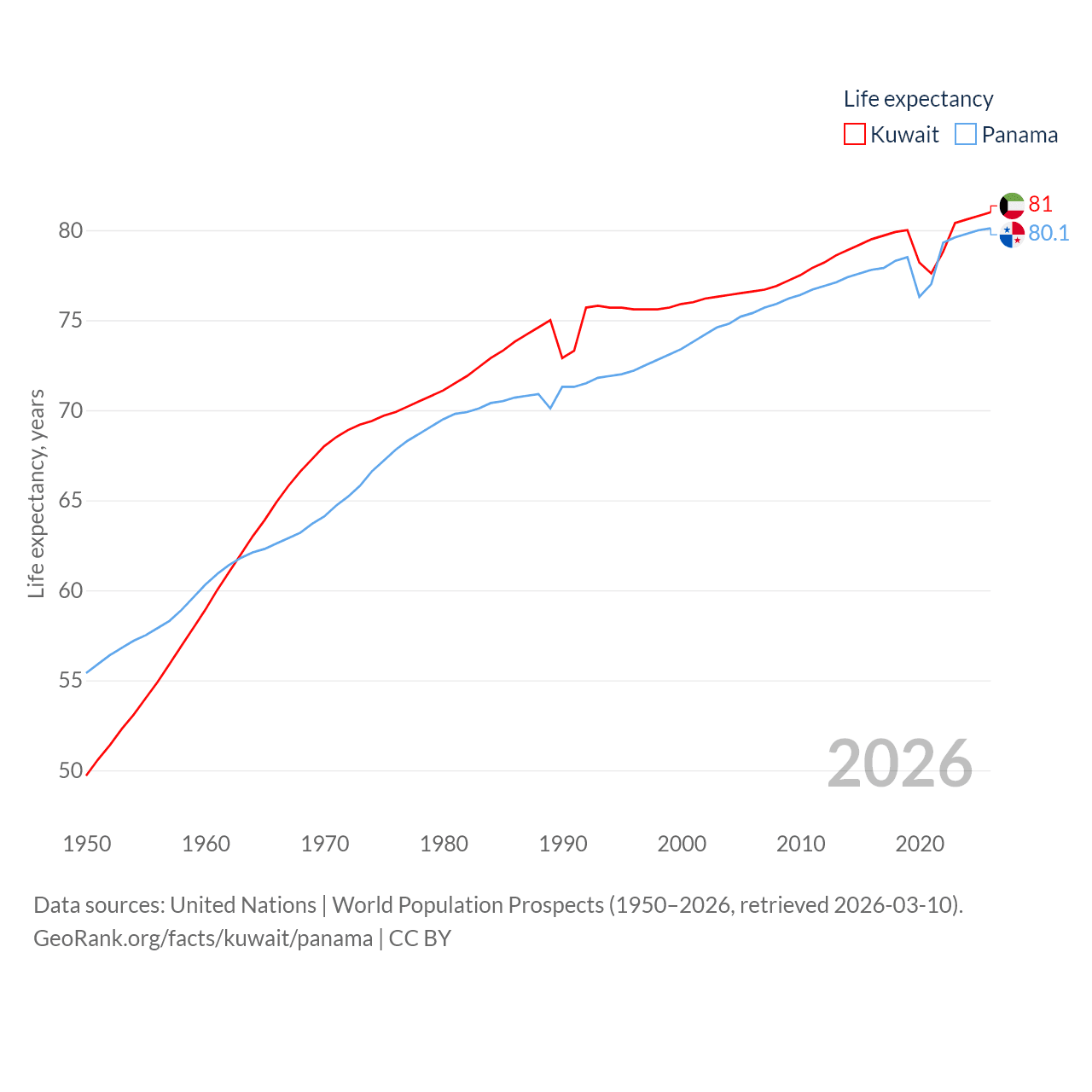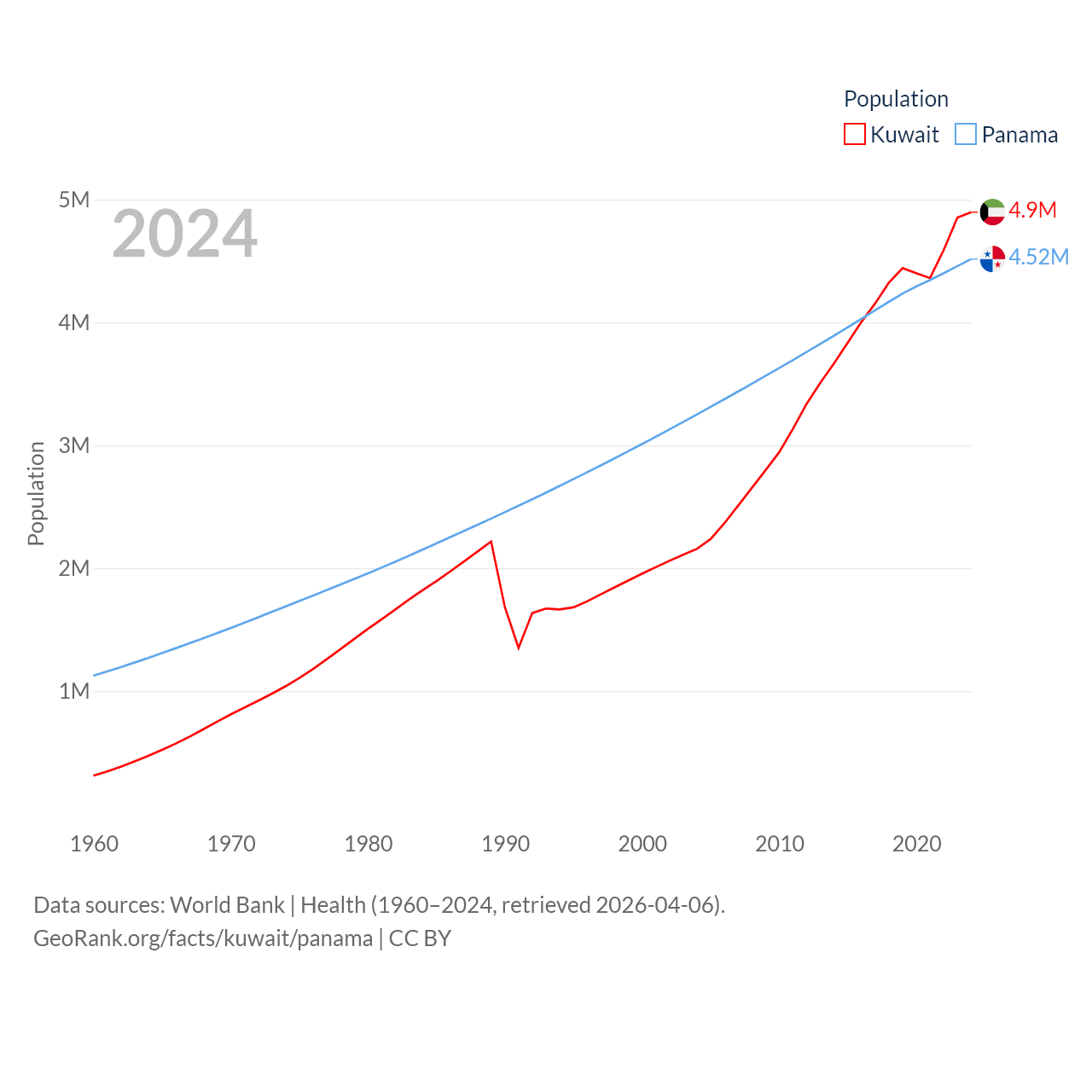 Kuwait has a population of 4.9M (ranked 127/197), compared with 4.52M in Panama (ranked 128/197). Kuwait's land area is 6,880 sq mi versus 28,641 sq mi for Panama (ranked 153rd vs. 115th).