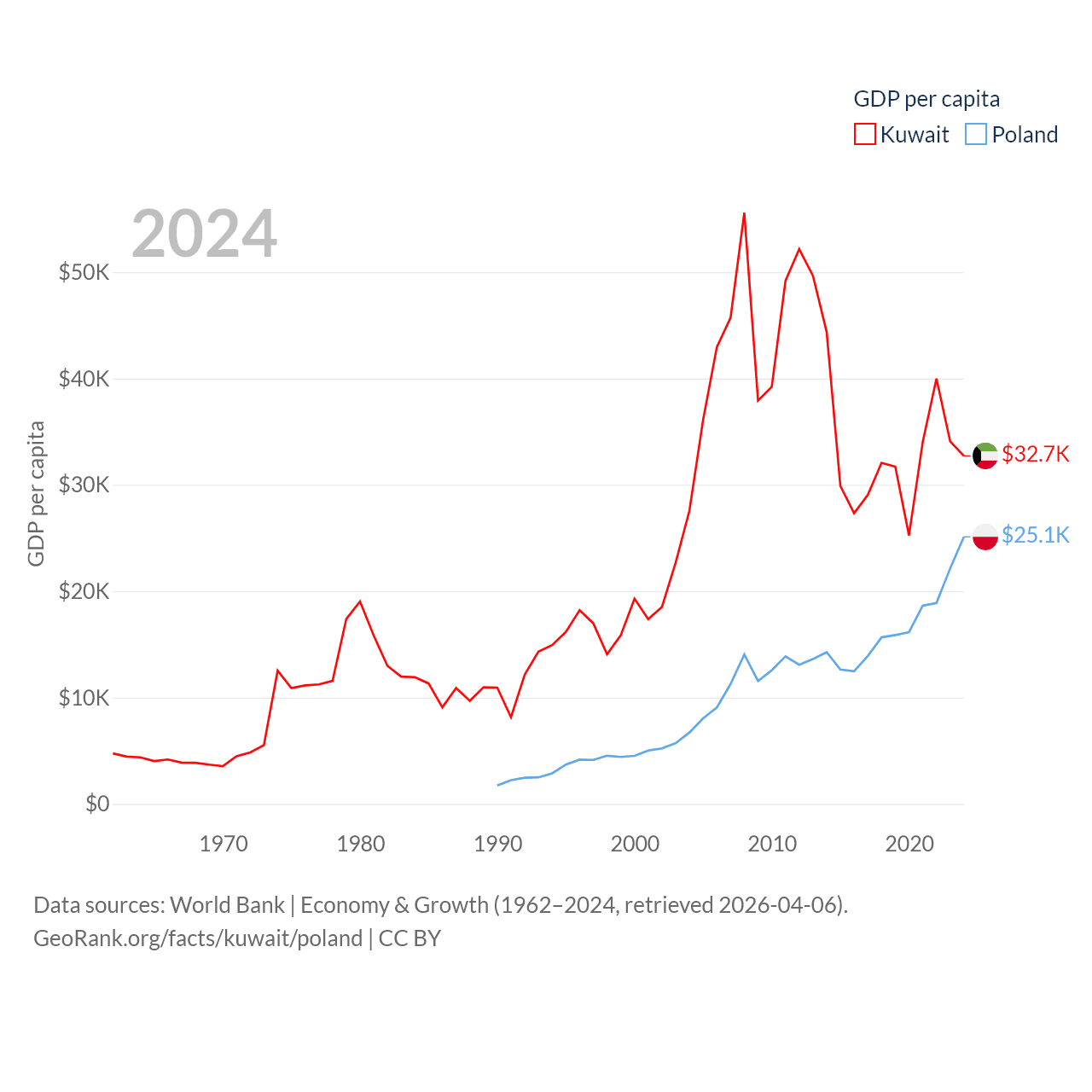 By GDP, Kuwait ranks 59/197 ($160B) and Poland ranks 21/197 ($918B). By GDP per capita, Kuwait ranks 37/197 ($32,718), while Poland ranks 48/197 ($25,104).