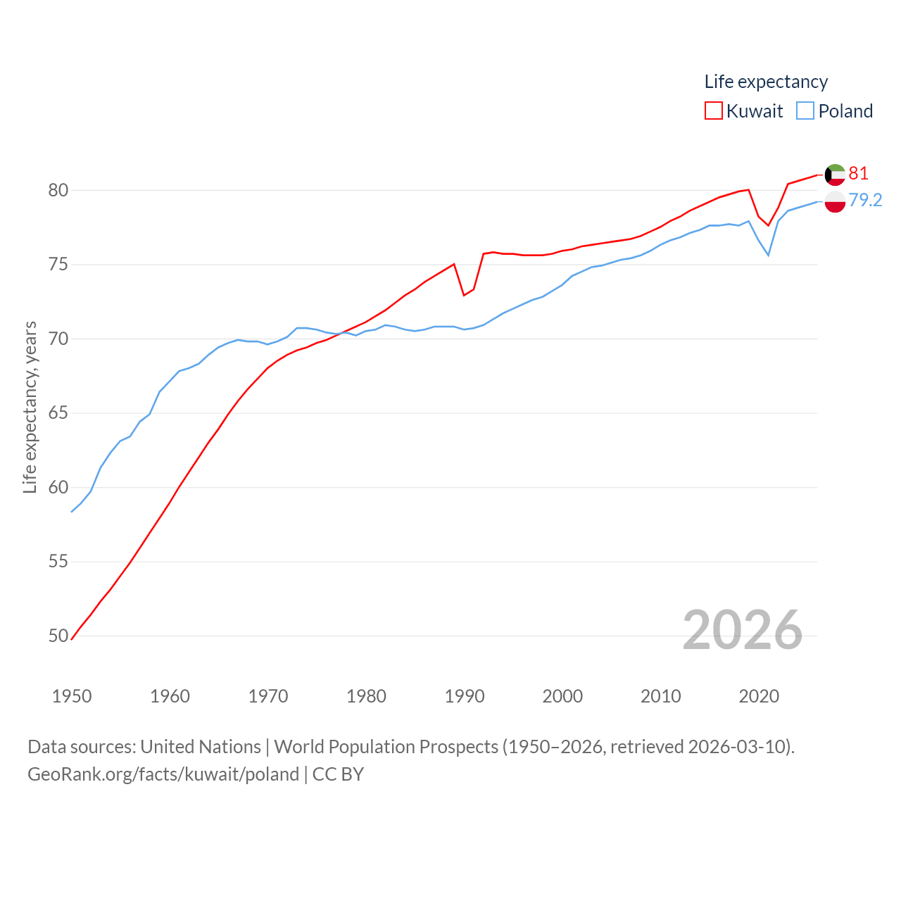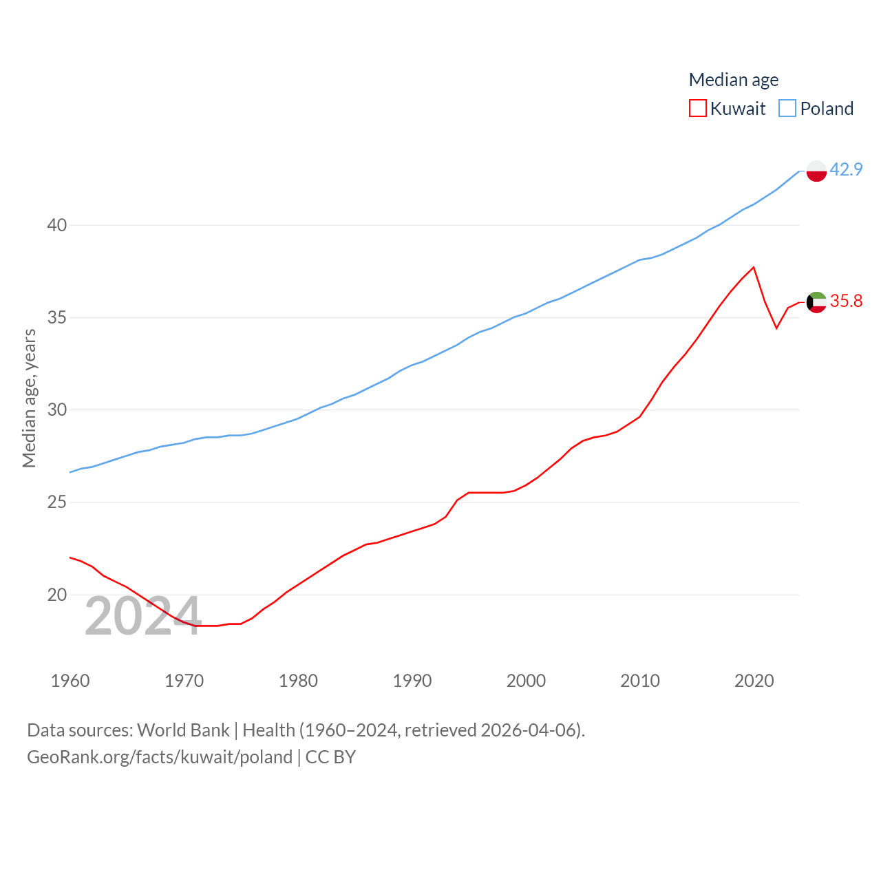 Kuwait has a population of 4.9M (ranked 127/197), compared with 36.6M in Poland (ranked 42/197). Kuwait's land area is 6,880 sq mi versus 118,252 sq mi for Poland (ranked 153rd vs. 69th).