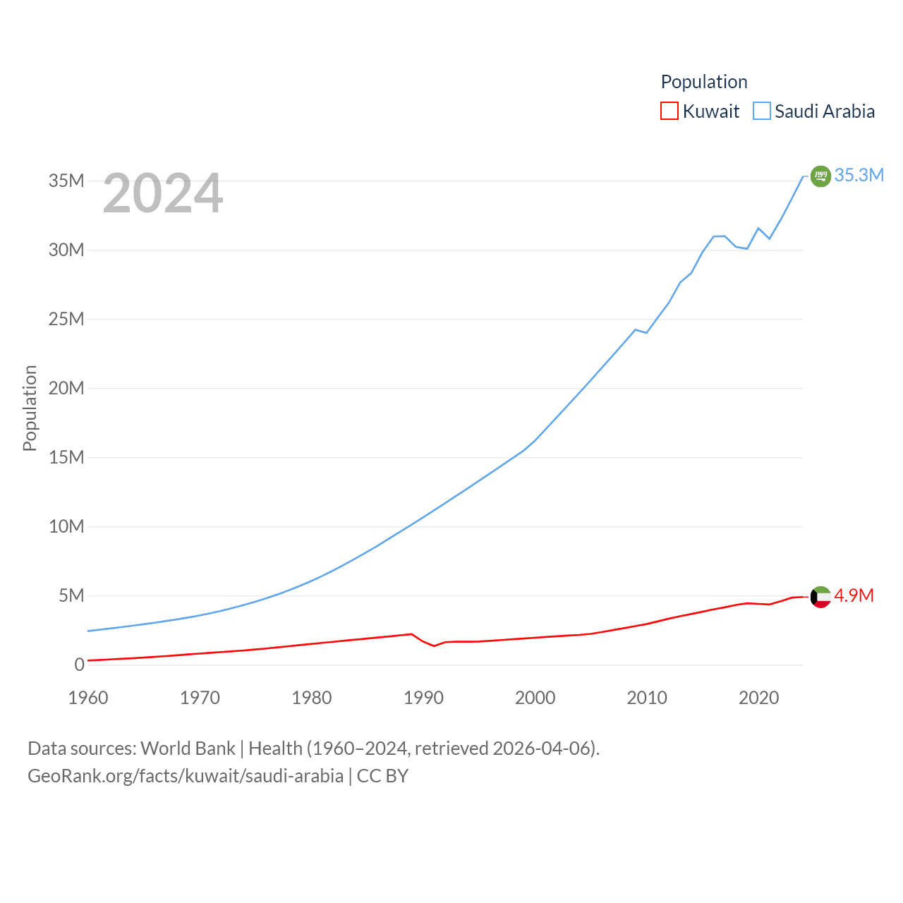 Kuwait has a population of 4.9M (ranked 127/197), compared with 35.3M in Saudi Arabia (ranked 45/197). Kuwait's land area is 6,880 sq mi versus 830,000 sq mi for Saudi Arabia (ranked 153rd vs. 12th).