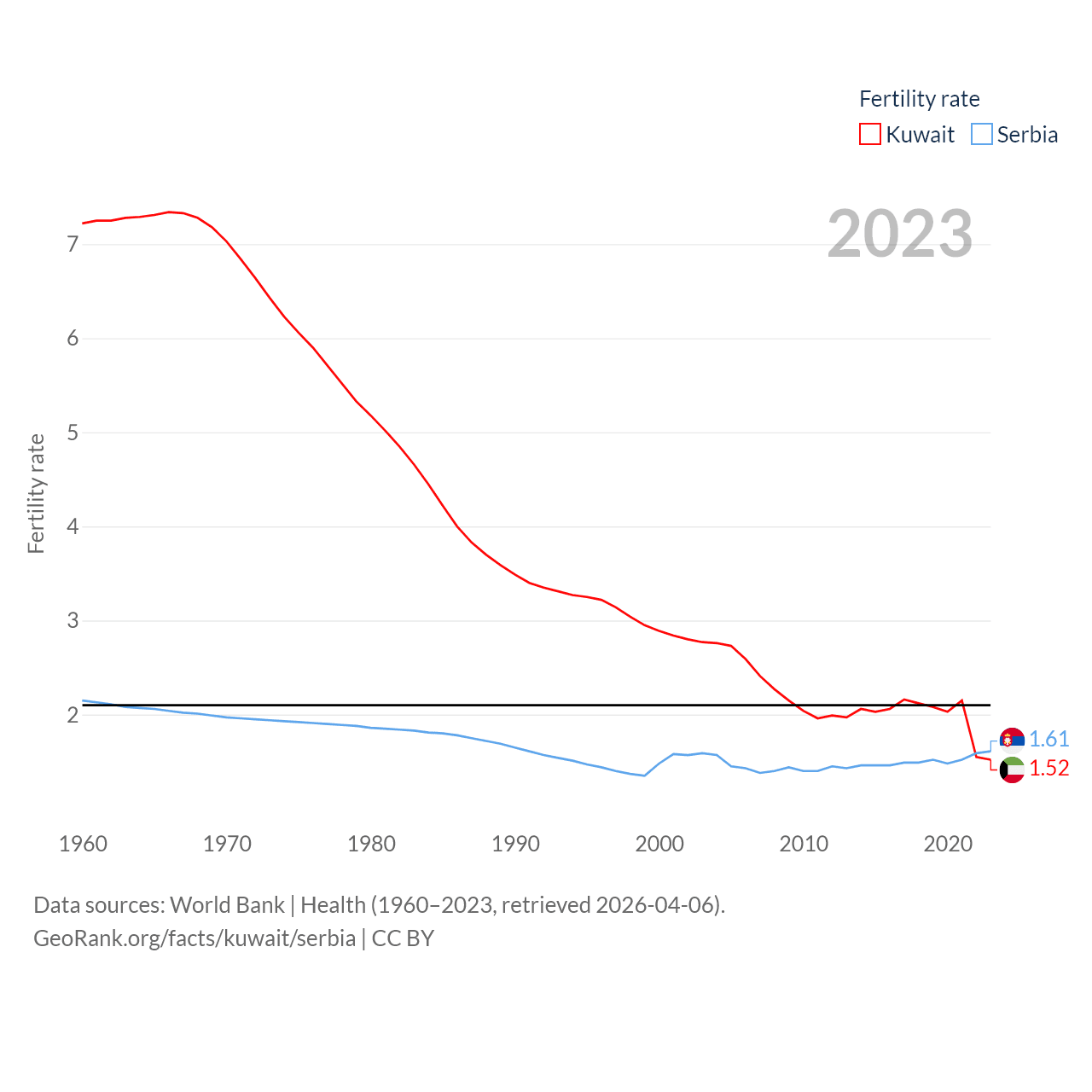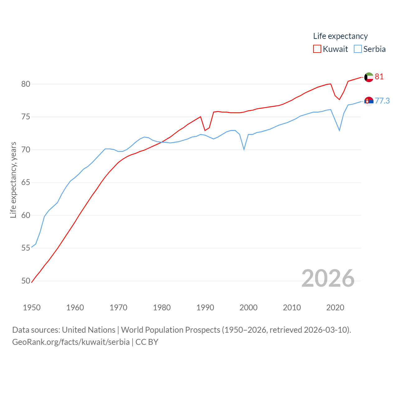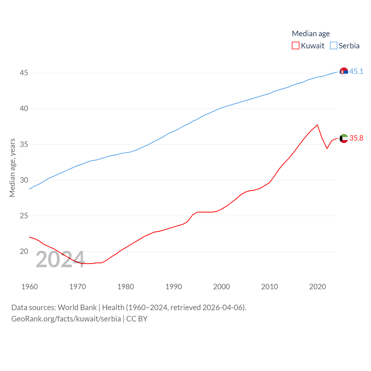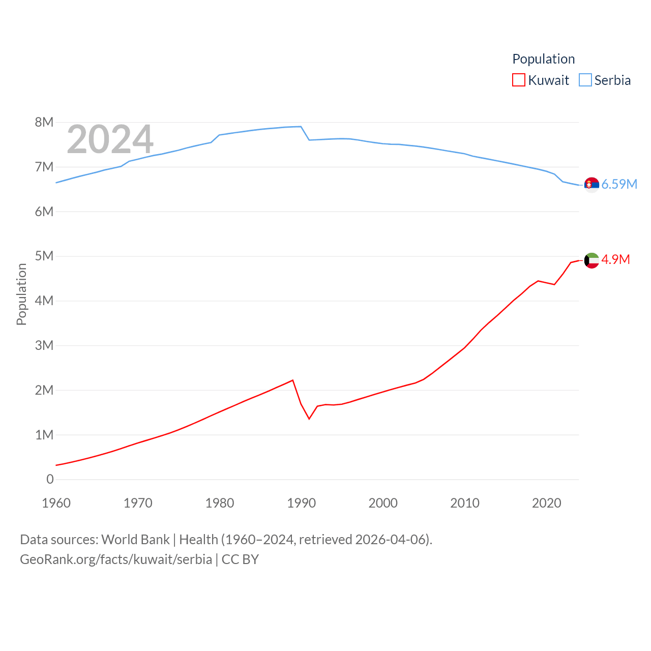Kuwait has a population of 4.9M (ranked 127/197), compared with 6.59M in Serbia (ranked 109/197). Kuwait's land area is 6,880 sq mi versus 32,467 sq mi for Serbia (ranked 153rd vs. 111th).