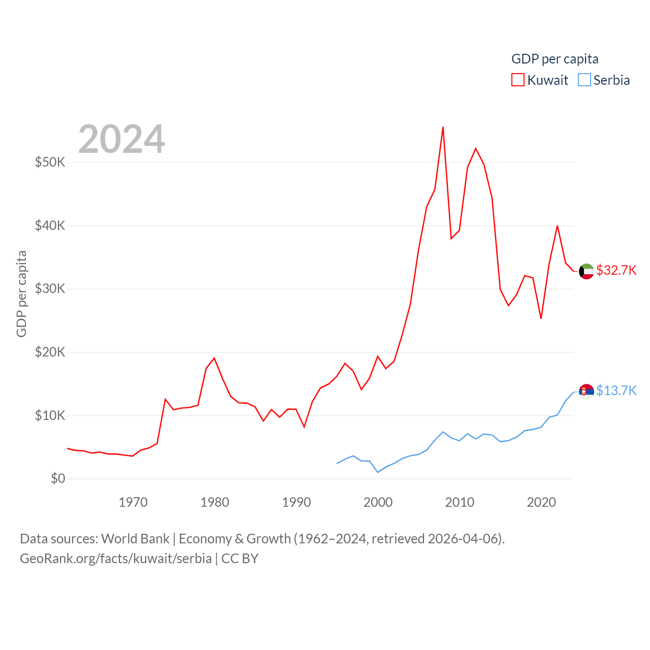 By GDP, Kuwait ranks 59/197 ($160B) and Serbia ranks 76/197 ($90.1B). By GDP per capita, Kuwait ranks 37/197 ($32,718), while Serbia ranks 73/197 ($13,679).