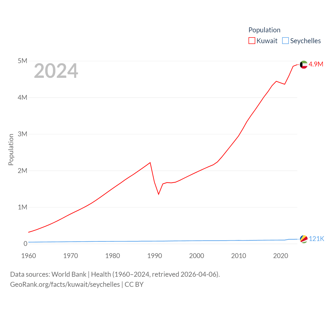 Kuwait has a population of 4.9M (ranked 127/197), compared with 121K in The Seychelles (ranked 181/197). Kuwait's land area is 6,880 sq mi versus 177.6 sq mi for The Seychelles (ranked 153rd vs. 181st).