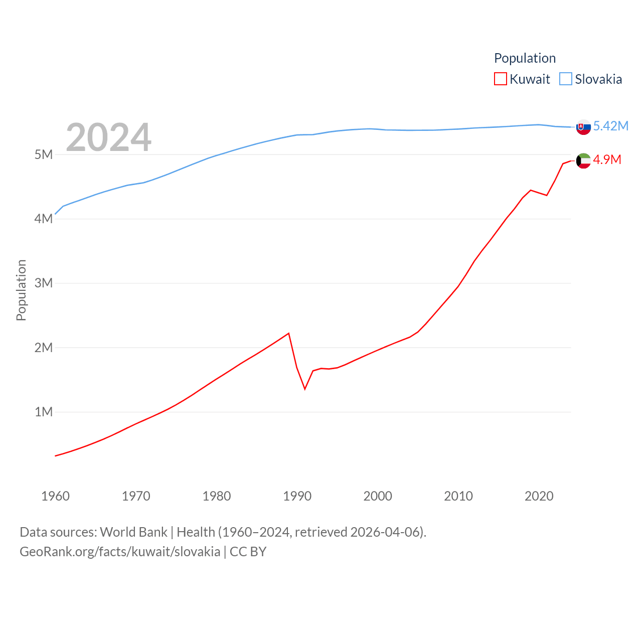 Kuwait has a population of 4.9M (ranked 127/197), compared with 5.42M in Slovakia (ranked 119/197). Kuwait's land area is 6,880 sq mi versus 18,564 sq mi for Slovakia (ranked 153rd vs. 128th).