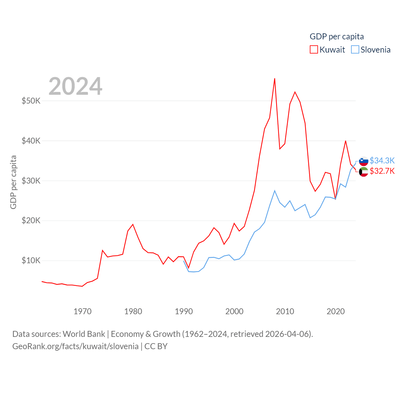 By GDP, Kuwait ranks 59/197 ($160B) and Slovenia ranks 86/197 ($73B). By GDP per capita, Kuwait ranks 37/197 ($32,718), while Slovenia ranks 34/197 ($34,301).