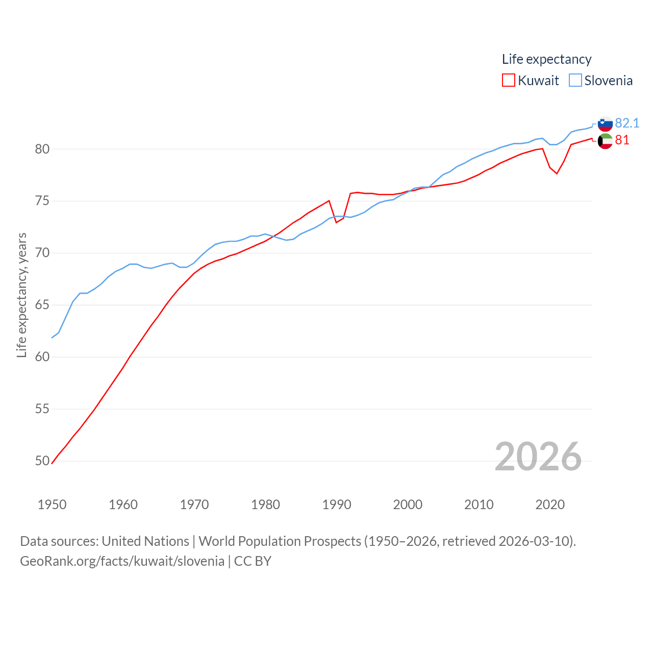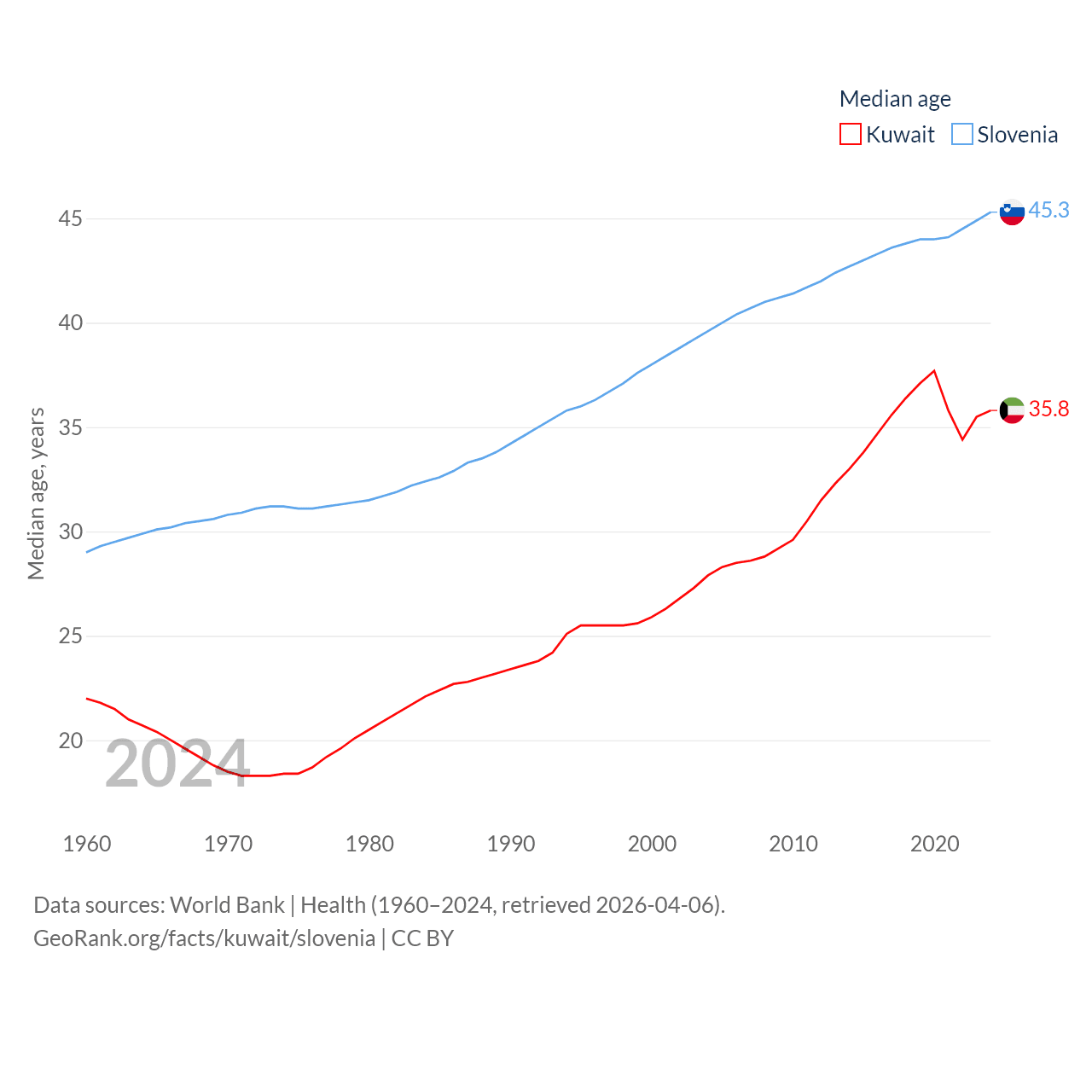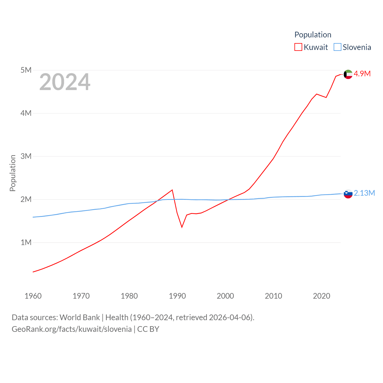Kuwait has a population of 4.9M (ranked 127/197), compared with 2.13M in Slovenia (ranked 147/197). Kuwait's land area is 6,880 sq mi versus 7,774 sq mi for Slovenia (ranked 153rd vs. 151st).