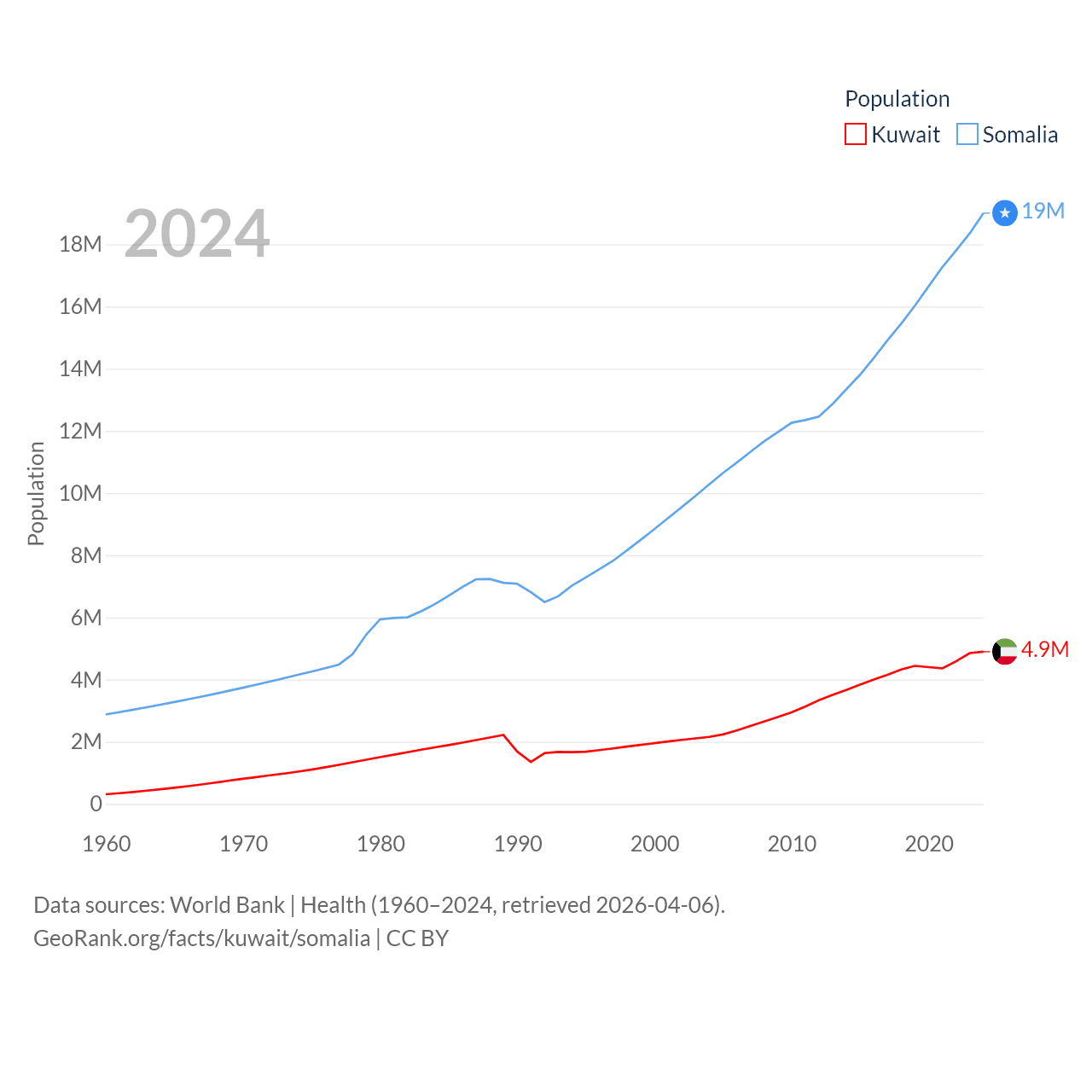 Kuwait has a population of 4.9M (ranked 127/197), compared with 19M in Somalia (ranked 68/197). Kuwait's land area is 6,880 sq mi versus 242,217 sq mi for Somalia (ranked 153rd vs. 42nd).