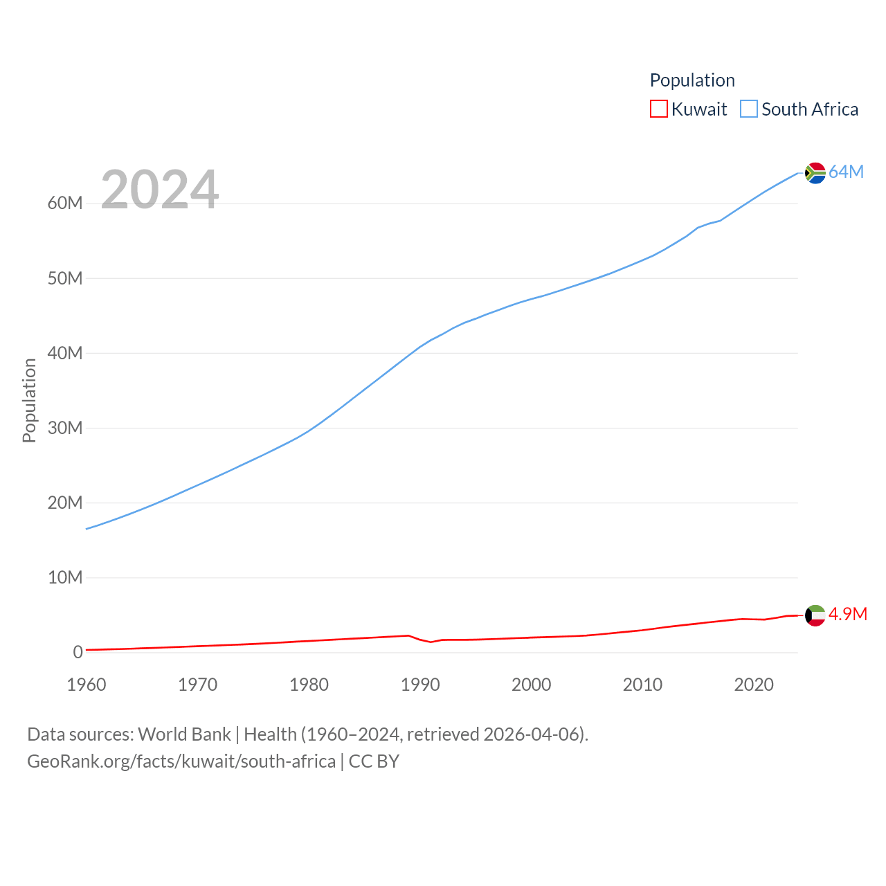 Kuwait has a population of 4.9M (ranked 127/197), compared with 64M in South Africa (ranked 24/197). Kuwait's land area is 6,880 sq mi versus 468,377 sq mi for South Africa (ranked 153rd vs. 24th).