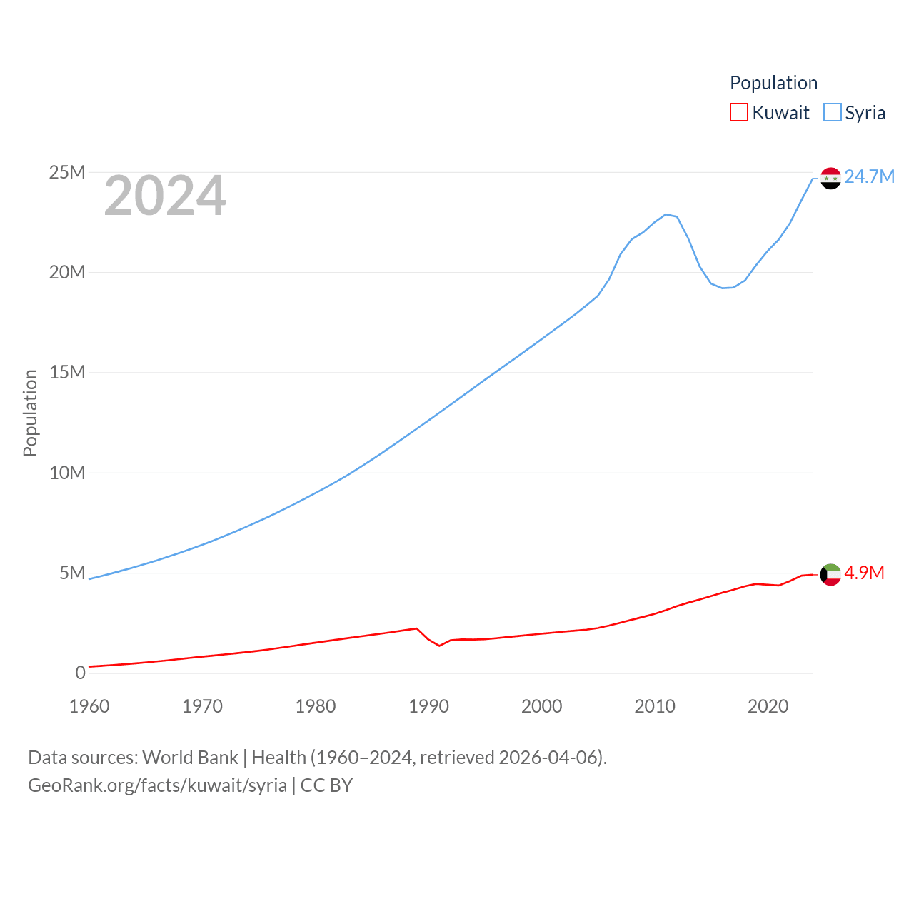 Kuwait has a population of 4.9M (ranked 127/197), compared with 24.7M in Syria (ranked 57/197). Kuwait's land area is 6,880 sq mi versus 70,900 sq mi for Syria (ranked 153rd vs. 87th).